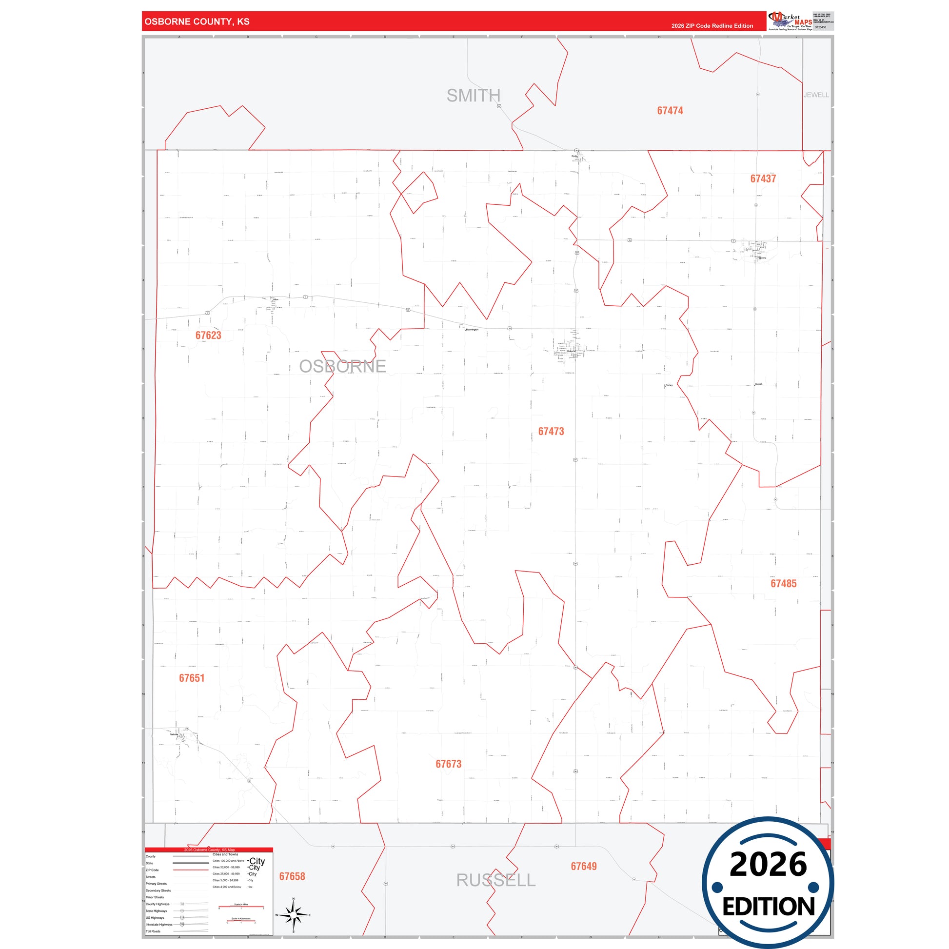The RedLine Style map of Osborne County, KS shows ZIP code areas overlaid on a detailed road network of Osborne County, Kansas. Ideal for drawing locations, territories, and other applications. Base map features include all major streets and highways labeled, cities and towns, county and state boundaries, neighborhood names, railroads, and a clean white background suitable for marking and planning.