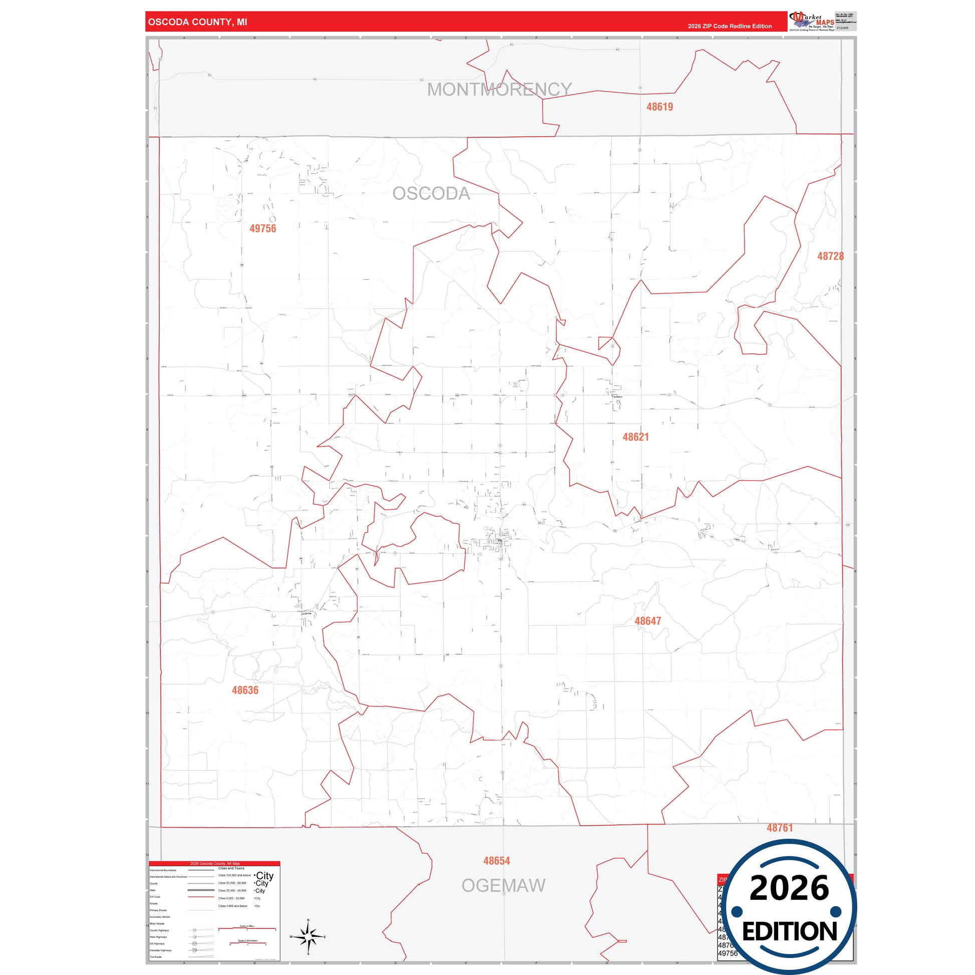 The RedLine Style map of Oscoda County, MI shows ZIP code areas overlaid on a detailed road network of Oscoda County, Michigan. Ideal for drawing locations, territories, and other applications. Base map features include all major streets and highways labeled, cities and towns, county and state boundaries, neighborhood names, railroads, and a clean white background suitable for marking and planning.