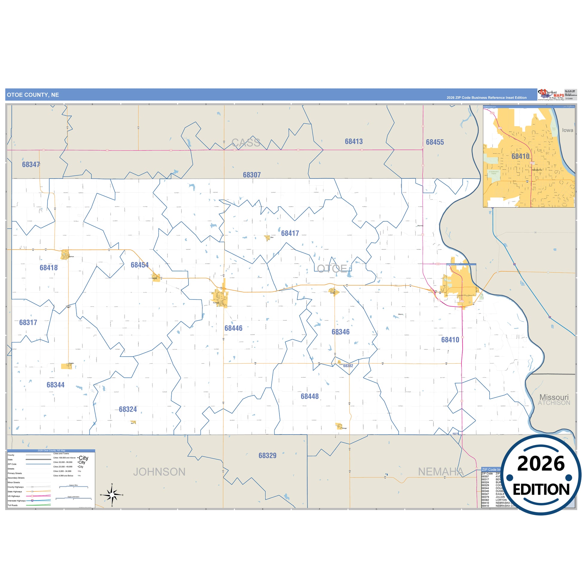 The Business Reference Style Otoe County, NE is a detailed map that includes all towns, cities, major roadways, and highways. Available in multiple wall map sizes, perfect for home, school, office, or business display.