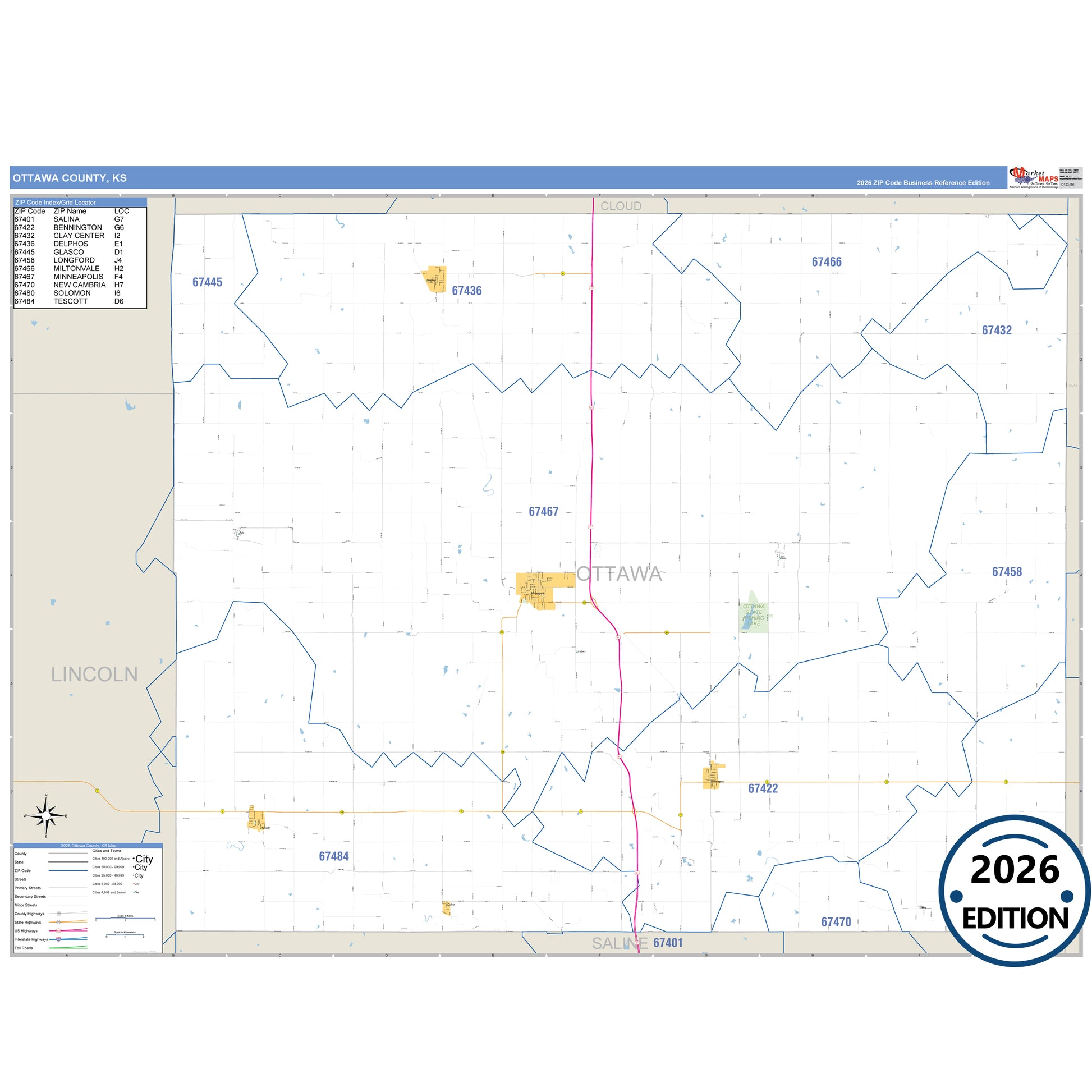 The Business Reference Style Ottawa County, KS is a detailed map that includes all towns, cities, major roadways, and highways. Available in multiple wall map sizes, perfect for home, school, office, or business display.