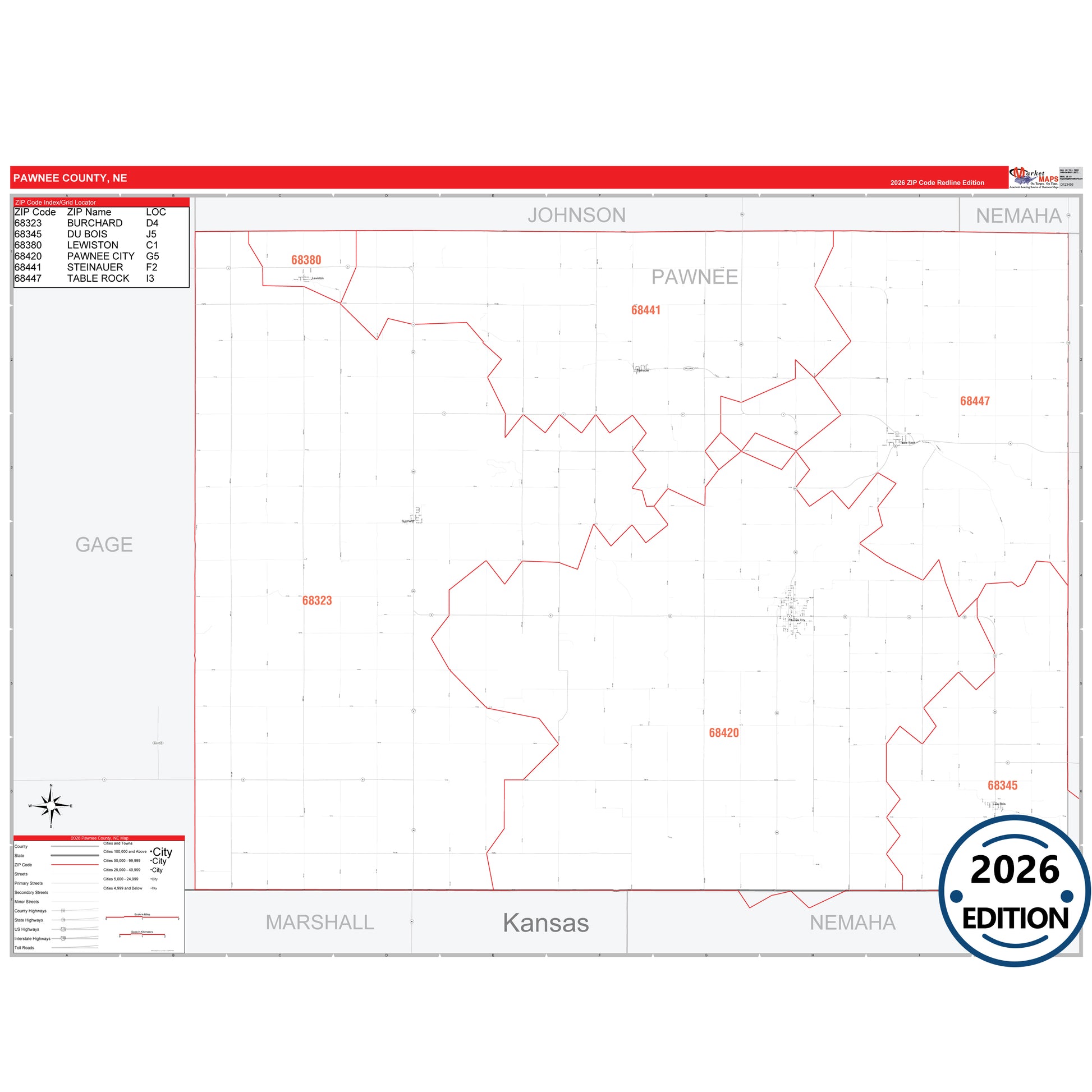 The RedLine Style map of Pawnee County, NE shows ZIP code areas overlaid on a detailed road network of Pawnee County, Nebraska. Ideal for drawing locations, territories, and other applications. Base map features include all major streets and highways labeled, cities and towns, county and state boundaries, neighborhood names, railroads, and a clean white background suitable for marking and planning.