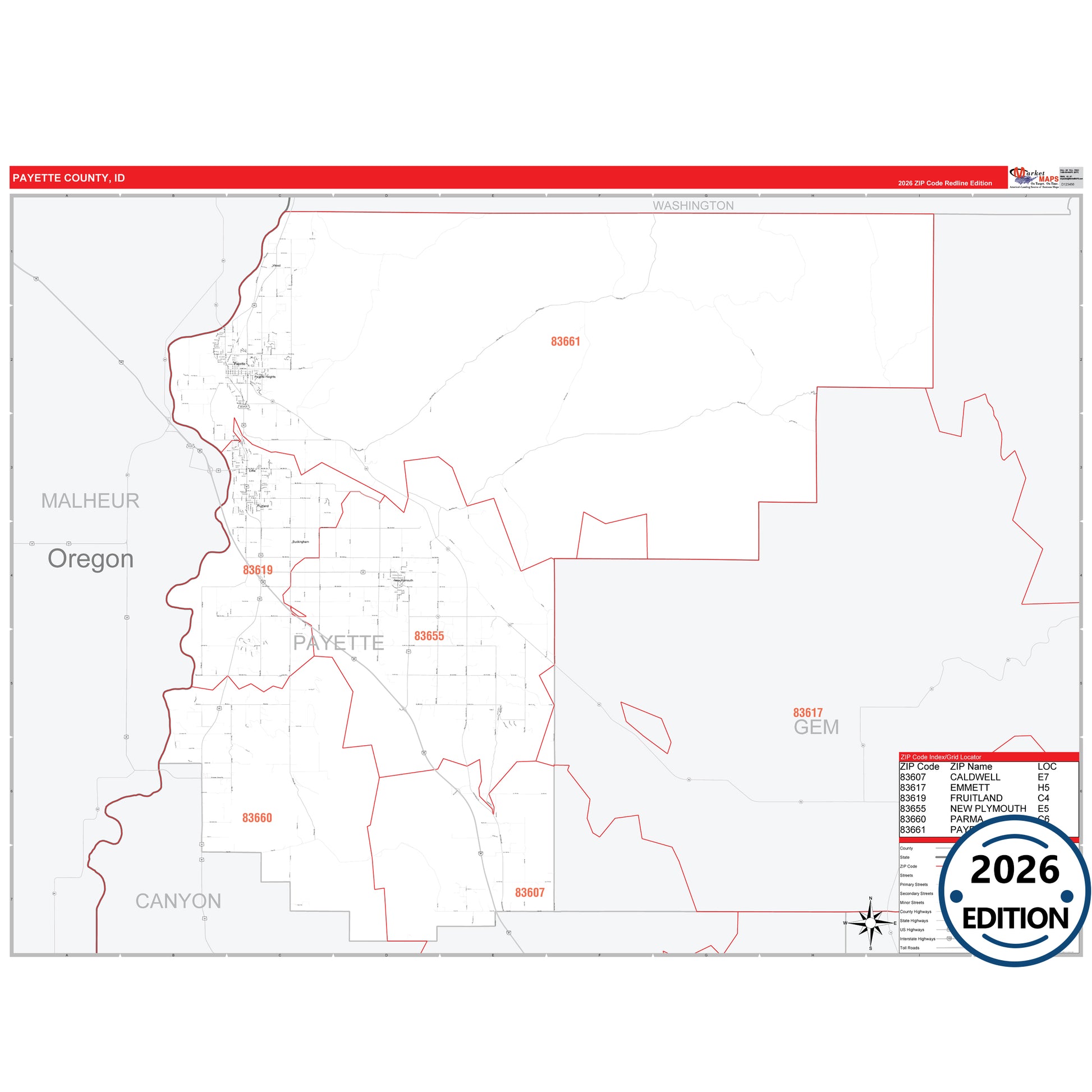 The RedLine Style map of Payette County, ID shows ZIP code areas overlaid on a detailed road network of Payette County, Idaho. Ideal for drawing locations, territories, and other applications. Base map features include all major streets and highways labeled, cities and towns, county and state boundaries, neighborhood names, railroads, and a clean white background suitable for marking and planning.