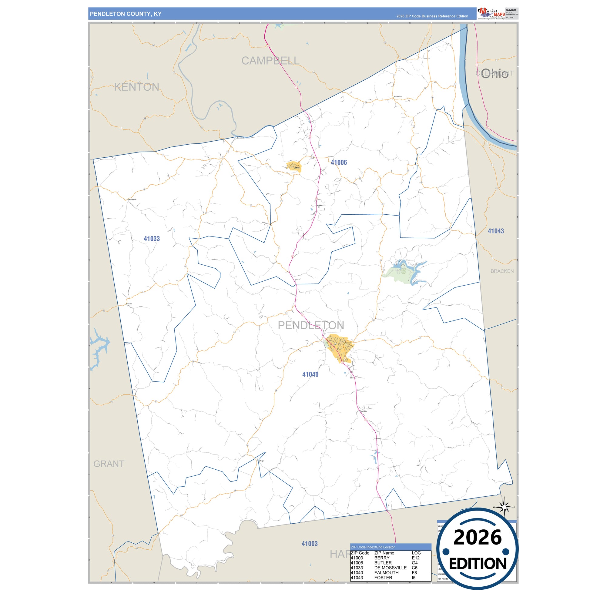 The Business Reference Style Pendleton County, KY is a detailed map that includes all towns, cities, major roadways, and highways. Available in multiple wall map sizes, perfect for home, school, office, or business display.