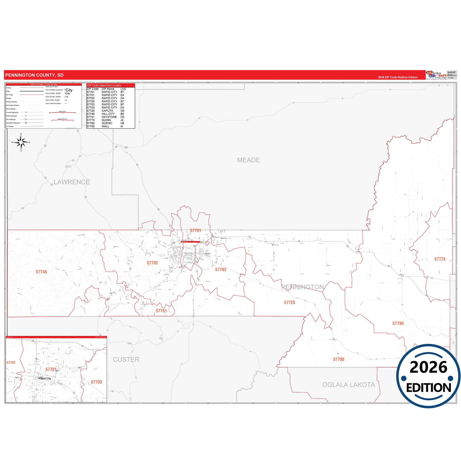 The RedLine Style map of Pennington County, SD shows ZIP code areas overlaid on a detailed road network of Pennington County, South Dakota. Ideal for drawing locations, territories, and other applications. Base map features include all major streets and highways labeled, cities and towns, county and state boundaries, neighborhood names, railroads, and a clean white background suitable for marking and planning.