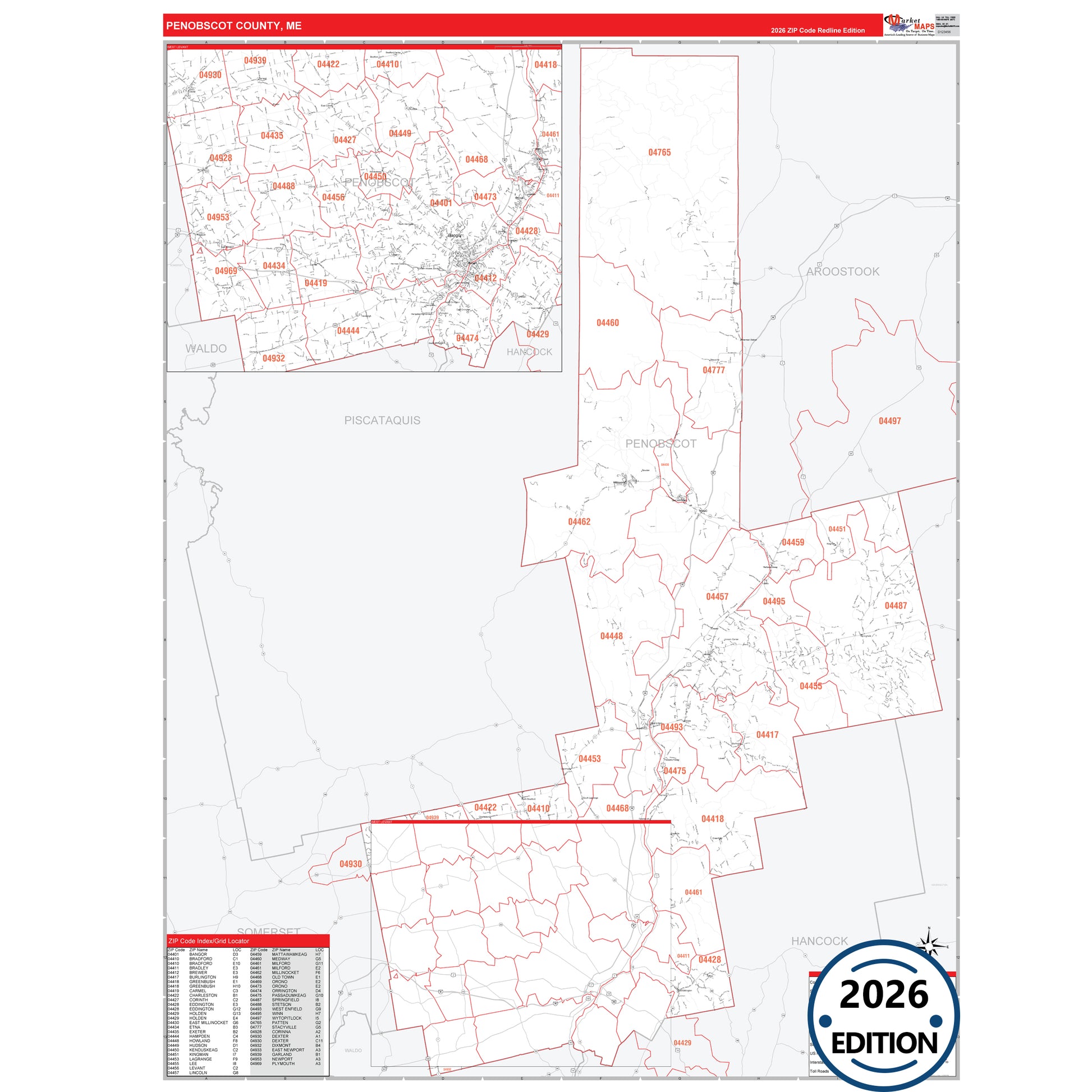 The RedLine Style map of Penobscot County, ME shows ZIP code areas overlaid on a detailed road network of Penobscot County, Maine. Ideal for drawing locations, territories, and other applications. Base map features include all major streets and highways labeled, cities and towns, county and state boundaries, neighborhood names, railroads, and a clean white background suitable for marking and planning.