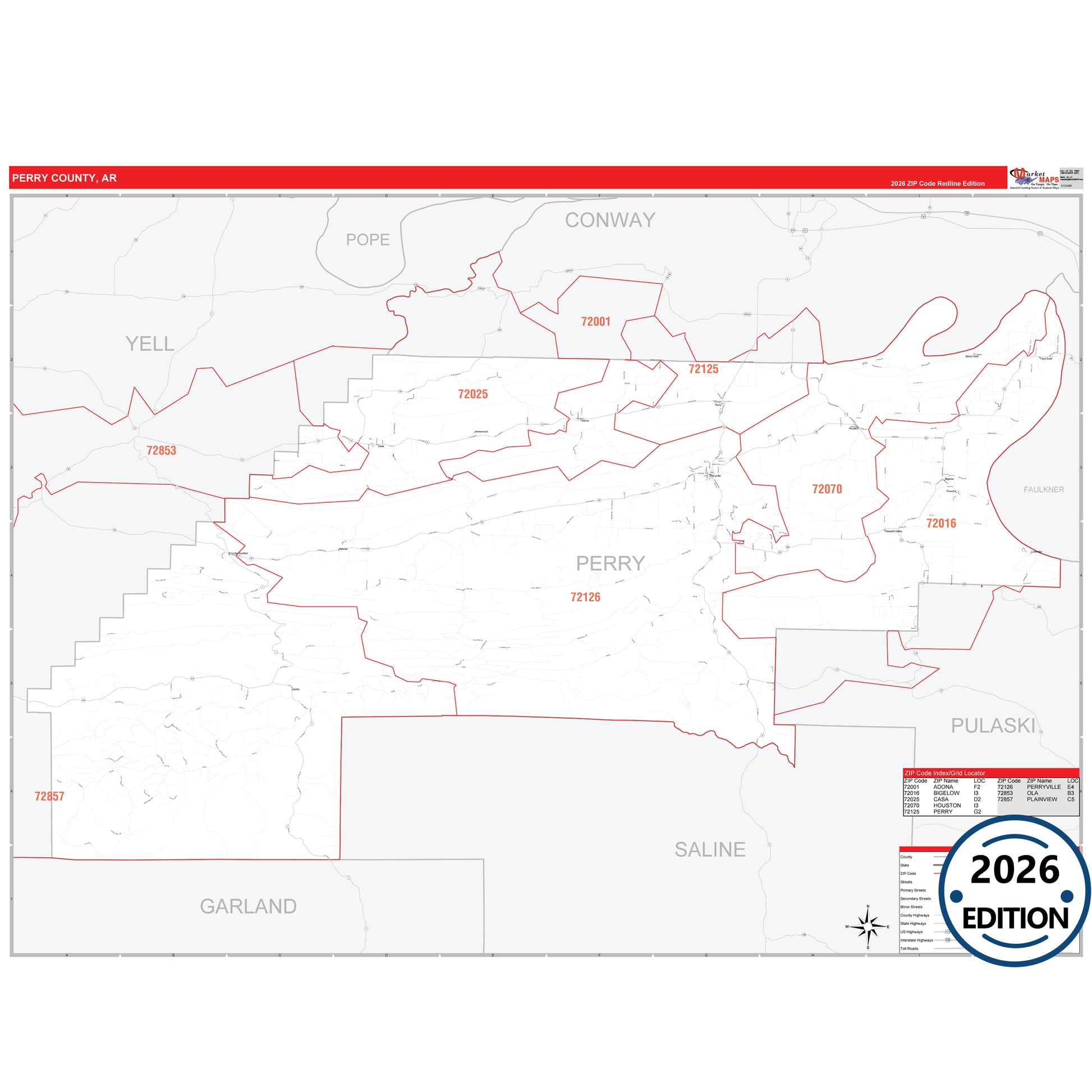 The RedLine Style map of Perry County, AR shows ZIP code areas overlaid on a detailed road network of Perry County, Arkansas. Ideal for drawing locations, territories, and other applications. Base map features include all major streets and highways labeled, cities and towns, county and state boundaries, neighborhood names, railroads, and a clean white background suitable for marking and planning.