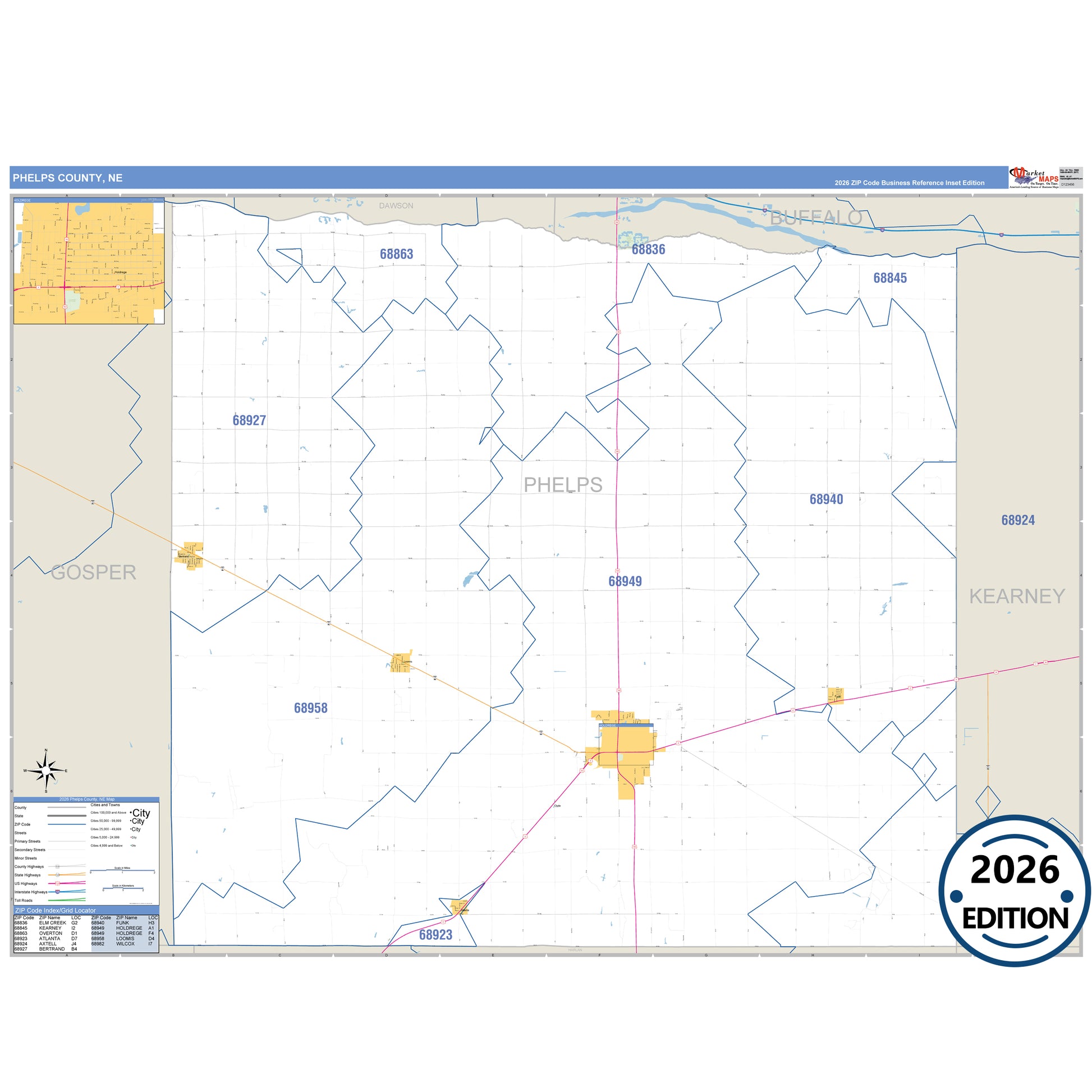 The Business Reference Style Phelps County, NE is a detailed map that includes all towns, cities, major roadways, and highways. Available in multiple wall map sizes, perfect for home, school, office, or business display.