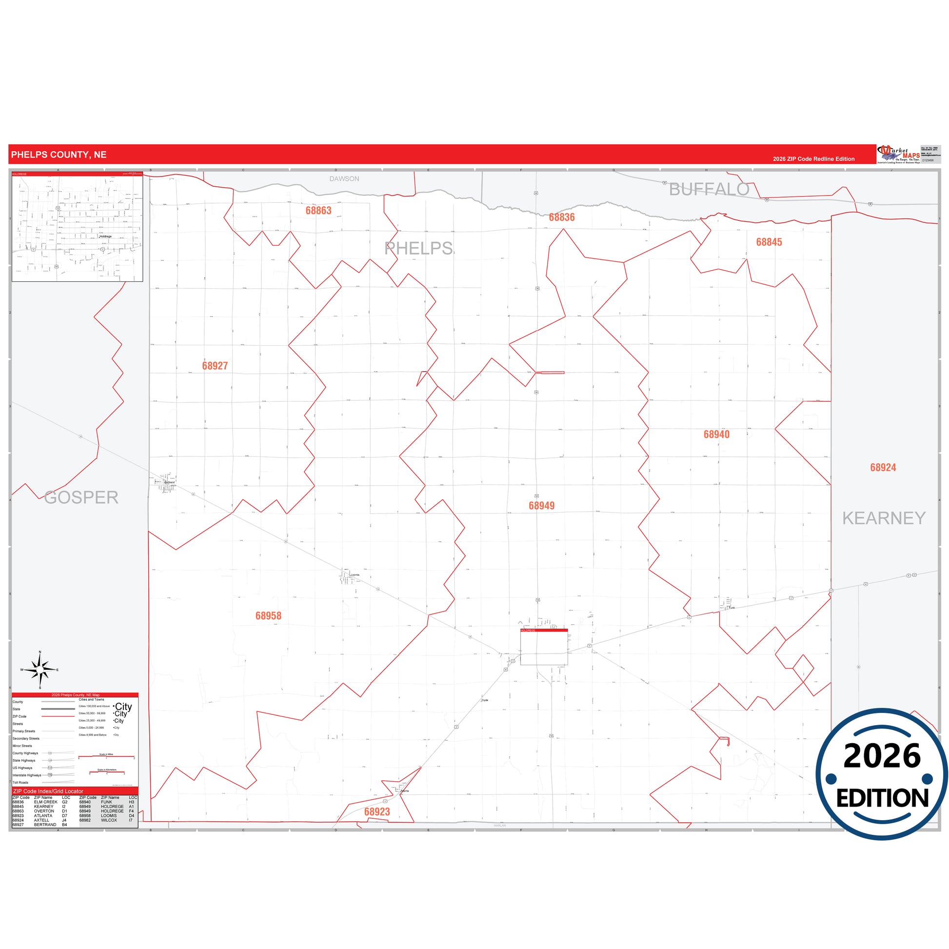 The RedLine Style map of Phelps County, NE shows ZIP code areas overlaid on a detailed road network of Phelps County, Nebraska. Ideal for drawing locations, territories, and other applications. Base map features include all major streets and highways labeled, cities and towns, county and state boundaries, neighborhood names, railroads, and a clean white background suitable for marking and planning.