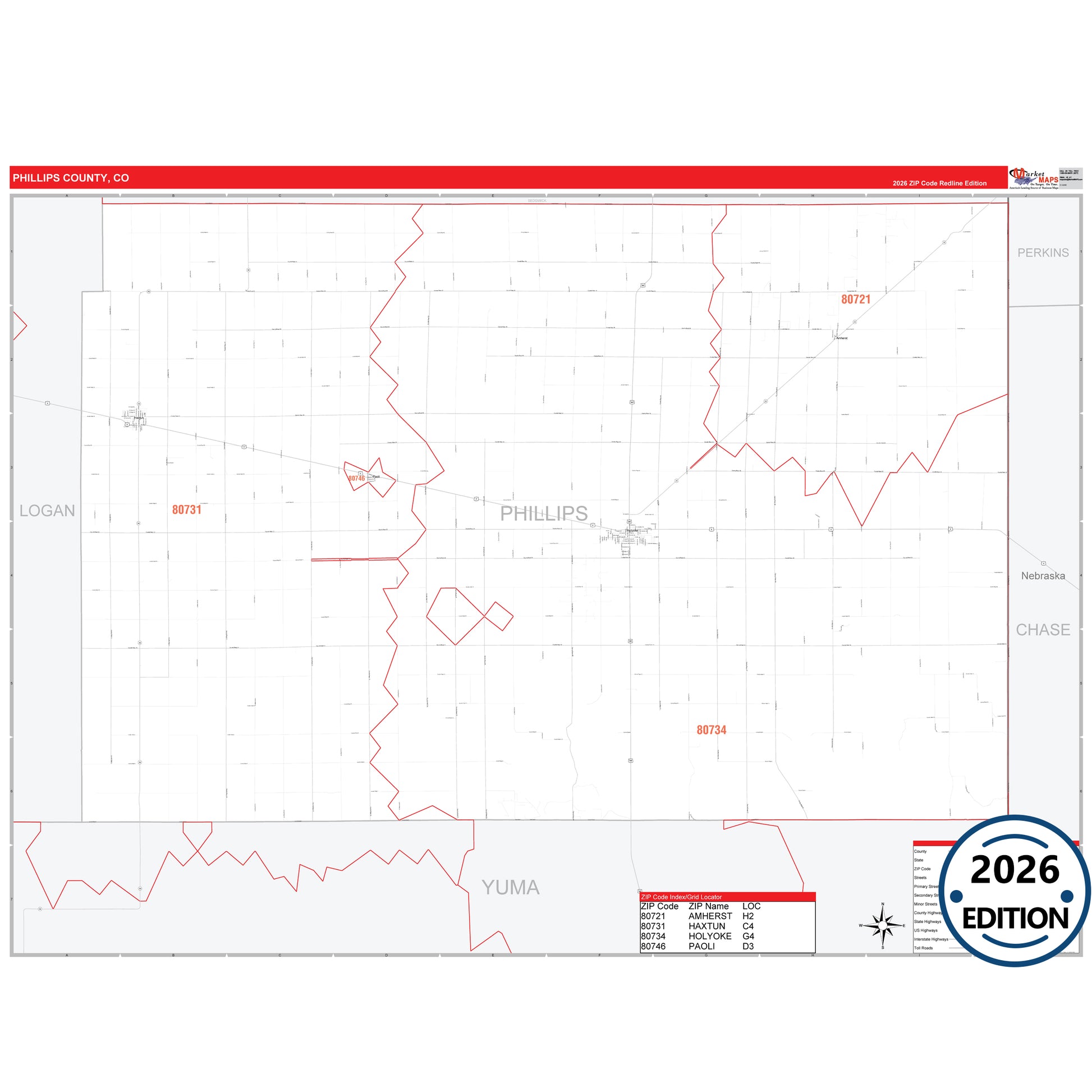 The RedLine Style map of Phillips County, CO shows ZIP code areas overlaid on a detailed road network of Phillips County, Colorado. Ideal for drawing locations, territories, and other applications. Base map features include all major streets and highways labeled, cities and towns, county and state boundaries, neighborhood names, railroads, and a clean white background suitable for marking and planning.