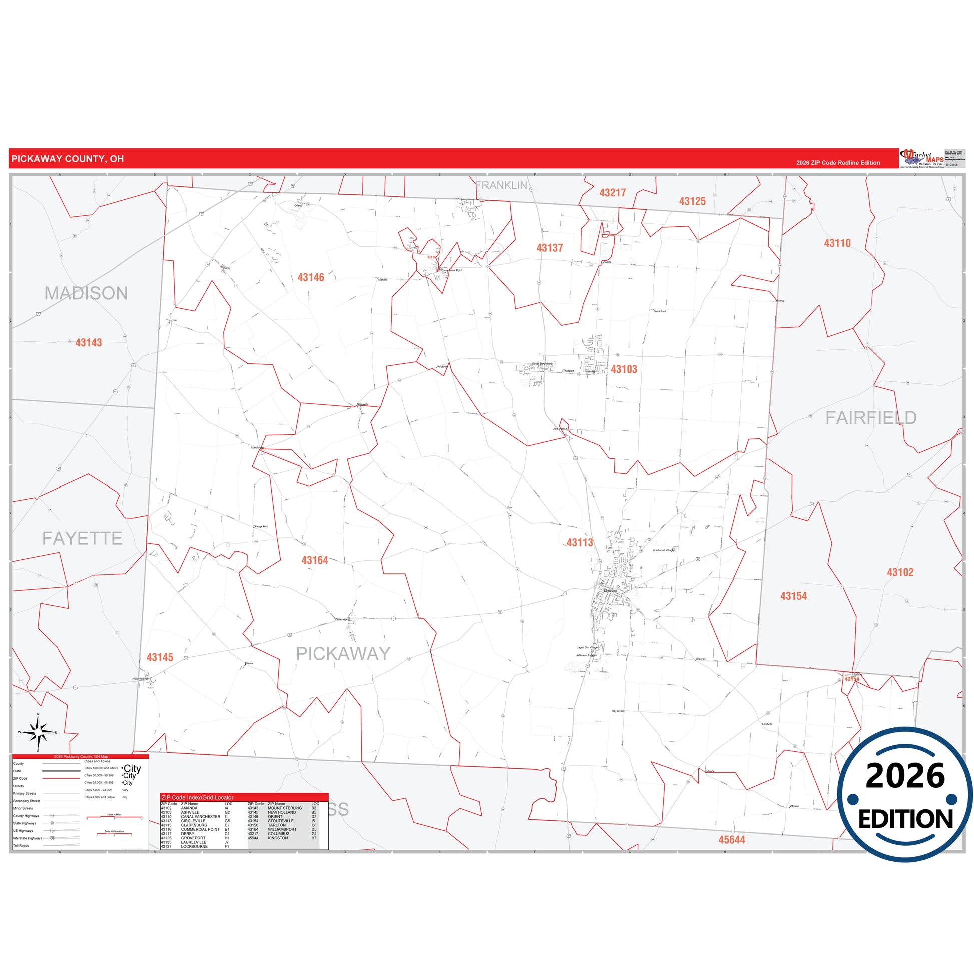 The RedLine Style map of Pickaway County, OH shows ZIP code areas overlaid on a detailed road network of Pickaway County, Ohio. Ideal for drawing locations, territories, and other applications. Base map features include all major streets and highways labeled, cities and towns, county and state boundaries, neighborhood names, railroads, and a clean white background suitable for marking and planning.