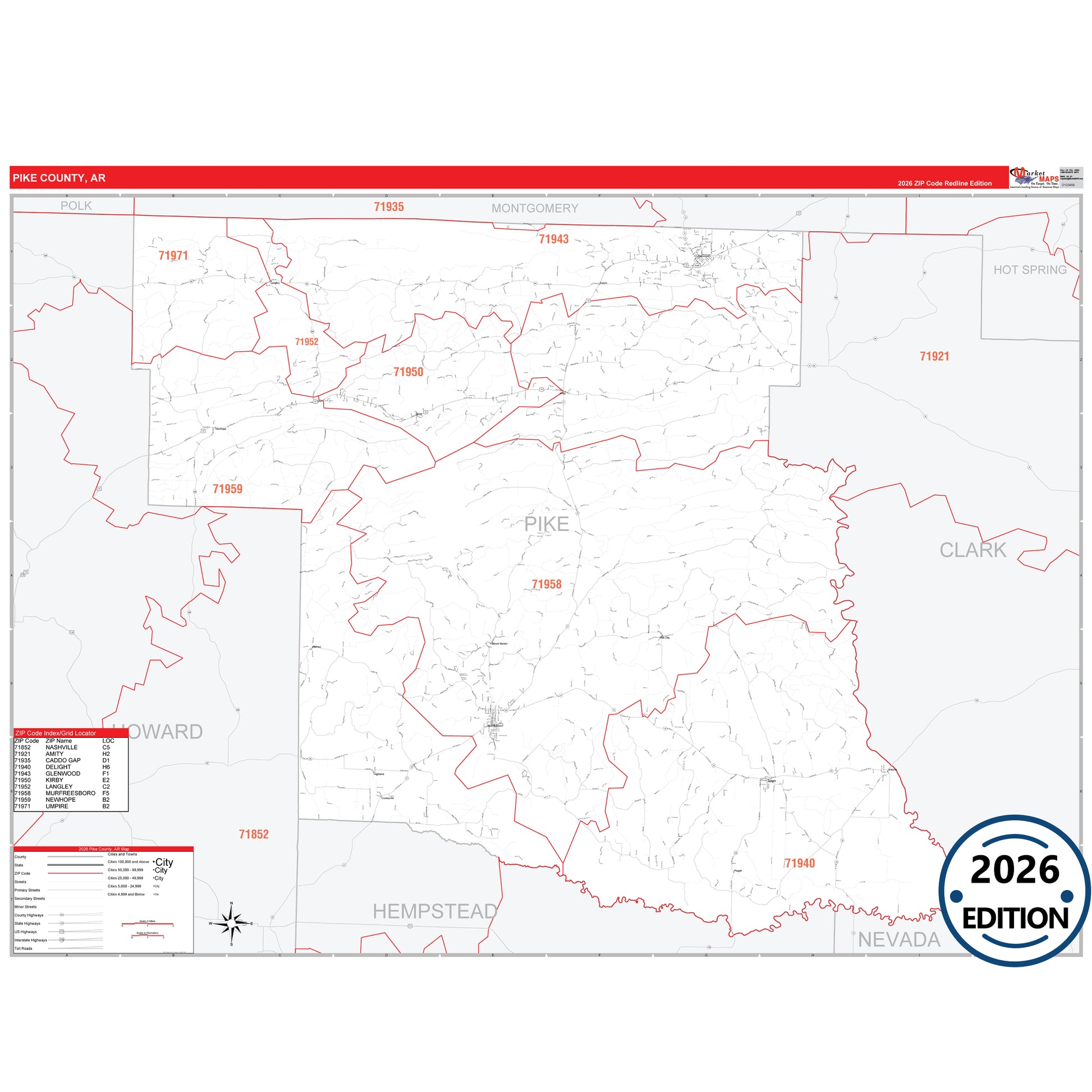 The RedLine Style map of Pike County, AR shows ZIP code areas overlaid on a detailed road network of Pike County, Arkansas. Ideal for drawing locations, territories, and other applications. Base map features include all major streets and highways labeled, cities and towns, county and state boundaries, neighborhood names, railroads, and a clean white background suitable for marking and planning.