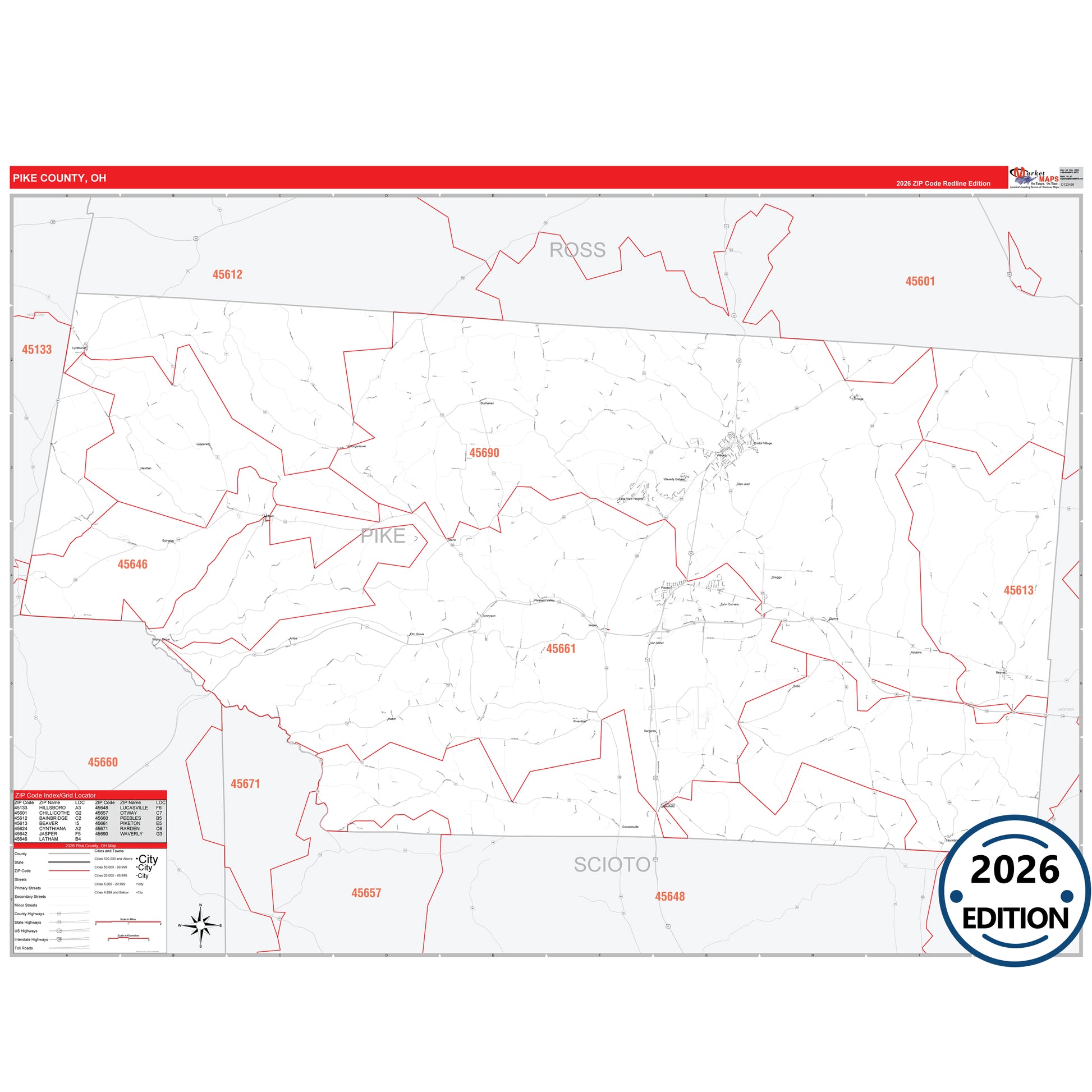 The RedLine Style map of Pike County, OH shows ZIP code areas overlaid on a detailed road network of Pike County, Ohio. Ideal for drawing locations, territories, and other applications. Base map features include all major streets and highways labeled, cities and towns, county and state boundaries, neighborhood names, railroads, and a clean white background suitable for marking and planning.