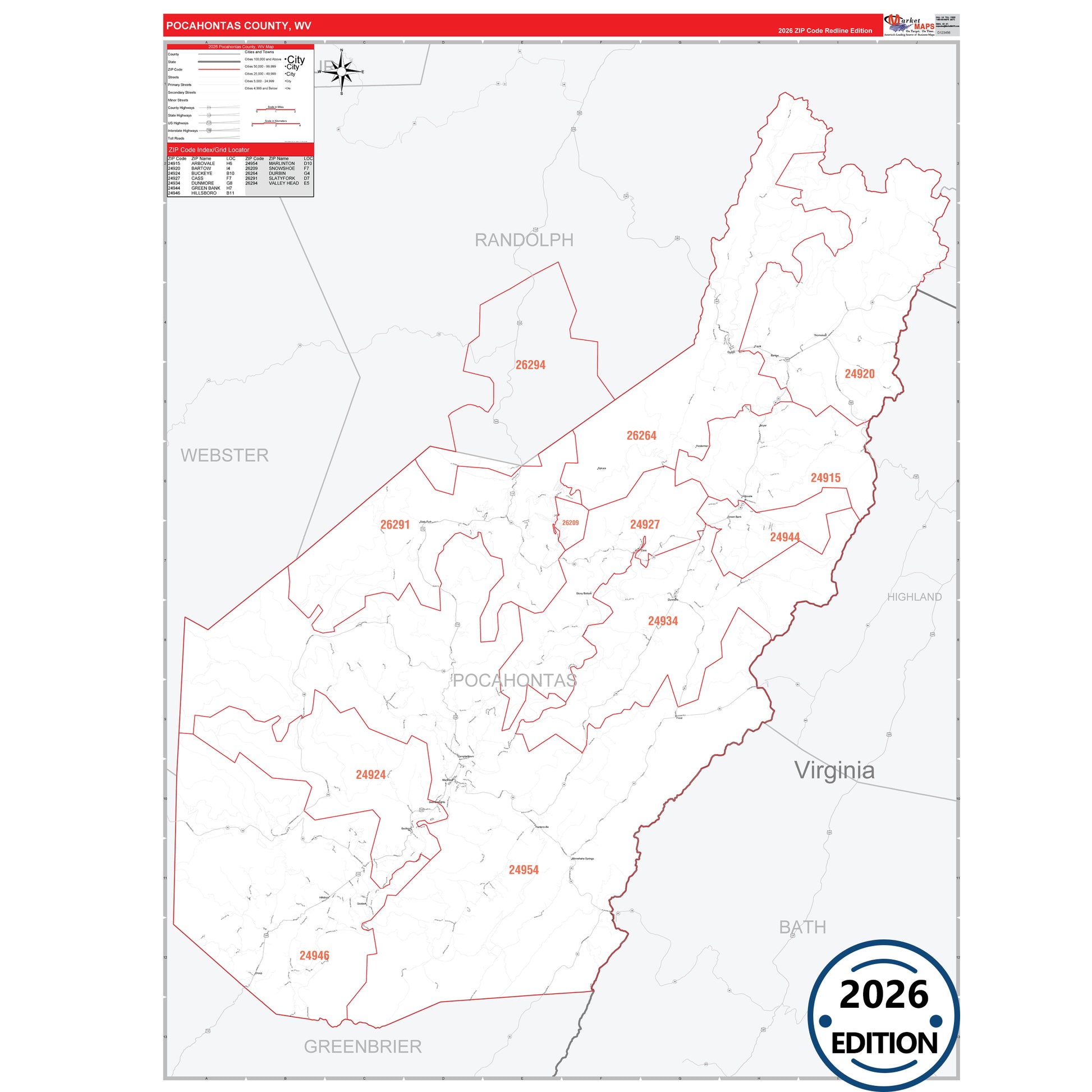 The RedLine Style map of Pocahontas County, WV shows ZIP code areas overlaid on a detailed road network of Pocahontas County, West Virginia. Ideal for drawing locations, territories, and other applications. Base map features include all major streets and highways labeled, cities and towns, county and state boundaries, neighborhood names, railroads, and a clean white background suitable for marking and planning.