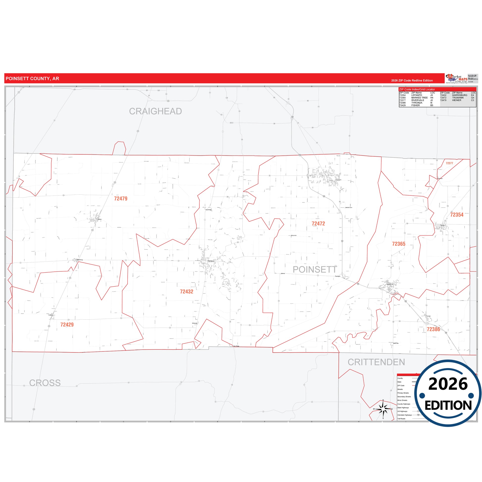 The RedLine Style map of Poinsett County, AR shows ZIP code areas overlaid on a detailed road network of Poinsett County, Arkansas. Ideal for drawing locations, territories, and other applications. Base map features include all major streets and highways labeled, cities and towns, county and state boundaries, neighborhood names, railroads, and a clean white background suitable for marking and planning.