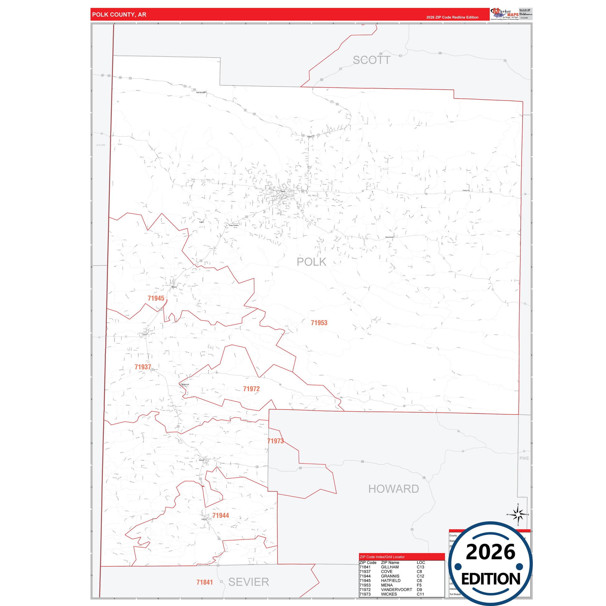 The RedLine Style map of Polk County, AR shows ZIP code areas overlaid on a detailed road network of Polk County, Arkansas. Ideal for drawing locations, territories, and other applications. Base map features include all major streets and highways labeled, cities and towns, county and state boundaries, neighborhood names, railroads, and a clean white background suitable for marking and planning.