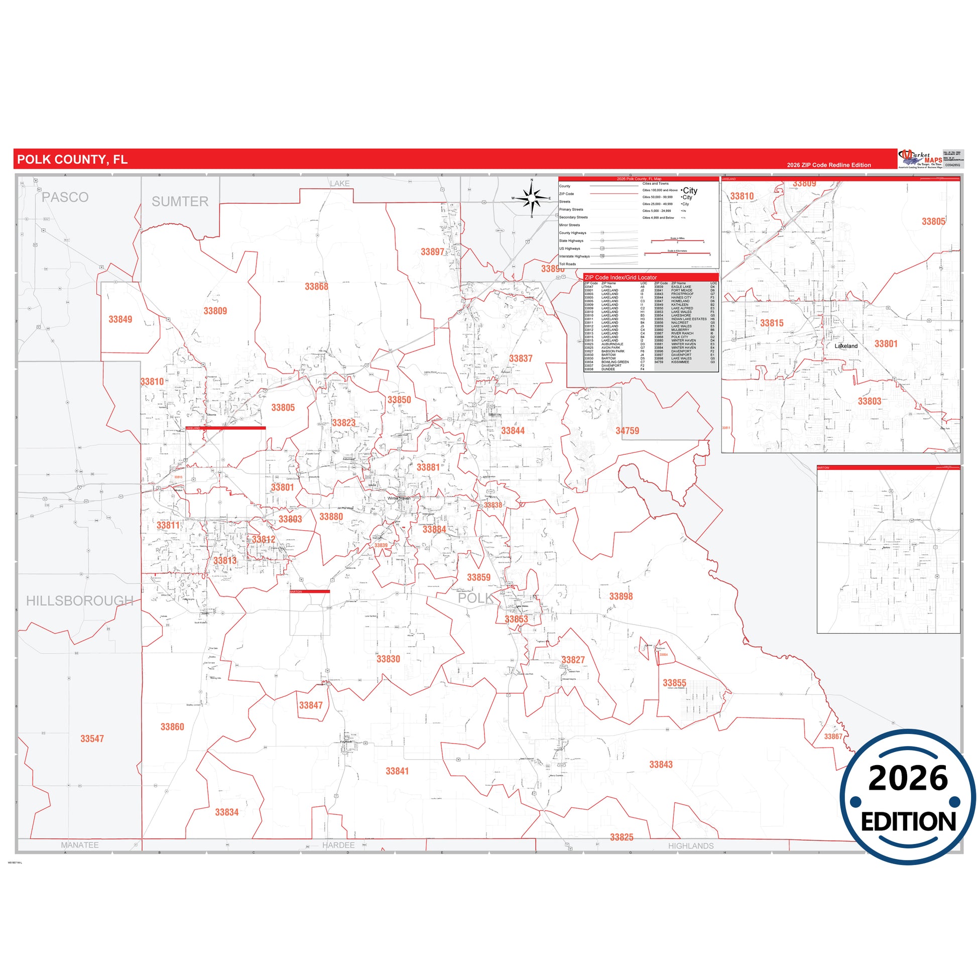 The RedLine Style map of Polk County, FL shows ZIP code areas overlaid on a detailed road network of Polk County, Florida. Ideal for drawing locations, territories, and other applications. Base map features include all major streets and highways labeled, cities and towns, county and state boundaries, neighborhood names, railroads, and a clean white background suitable for marking and planning.