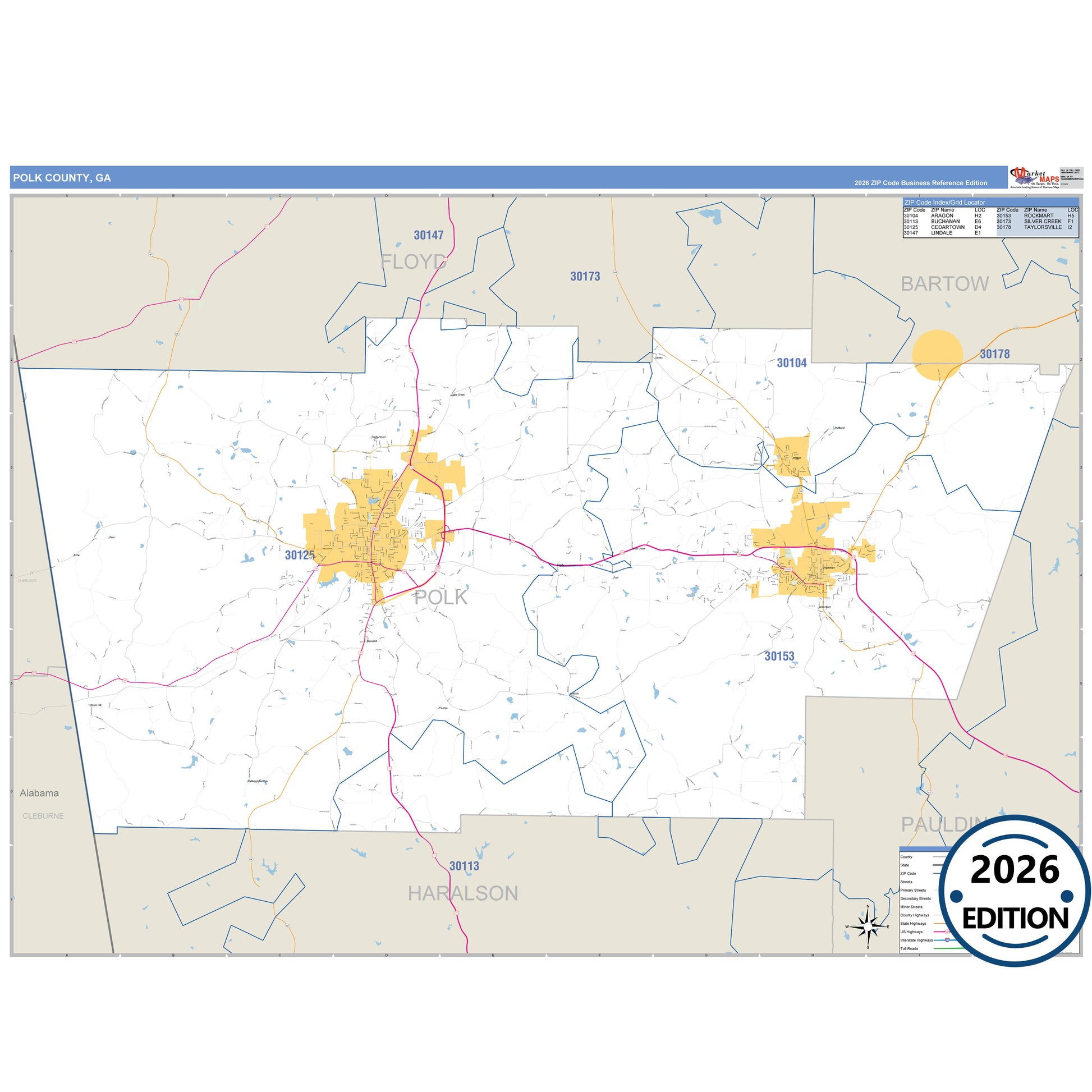 The Business Reference Style Polk County, GA is a detailed map that includes all towns, cities, major roadways, and highways. Available in multiple wall map sizes, perfect for home, school, office, or business display.
