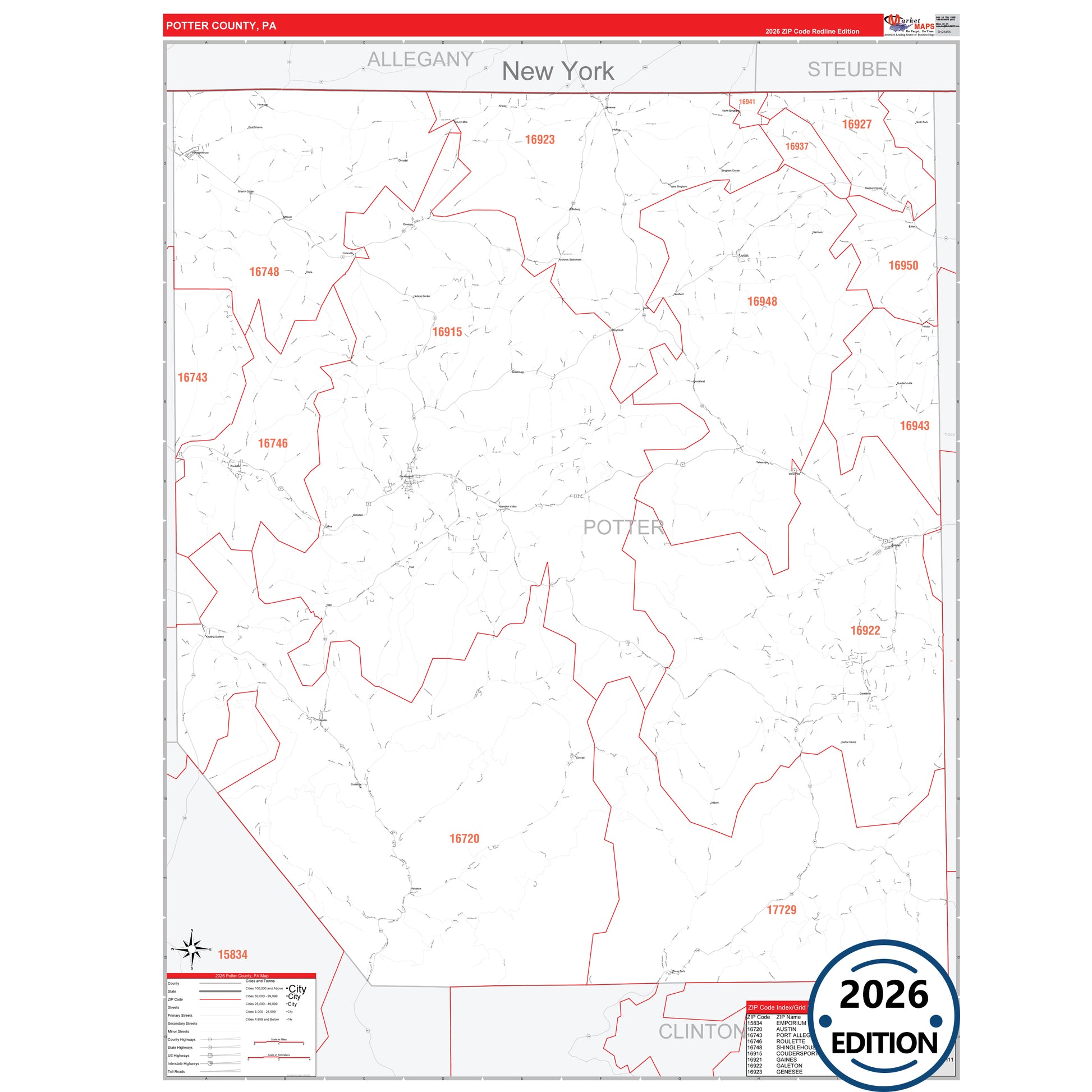 The RedLine Style map of Potter County, PA shows ZIP code areas overlaid on a detailed road network of Potter County, Pennsylvania. Ideal for drawing locations, territories, and other applications. Base map features include all major streets and highways labeled, cities and towns, county and state boundaries, neighborhood names, railroads, and a clean white background suitable for marking and planning.