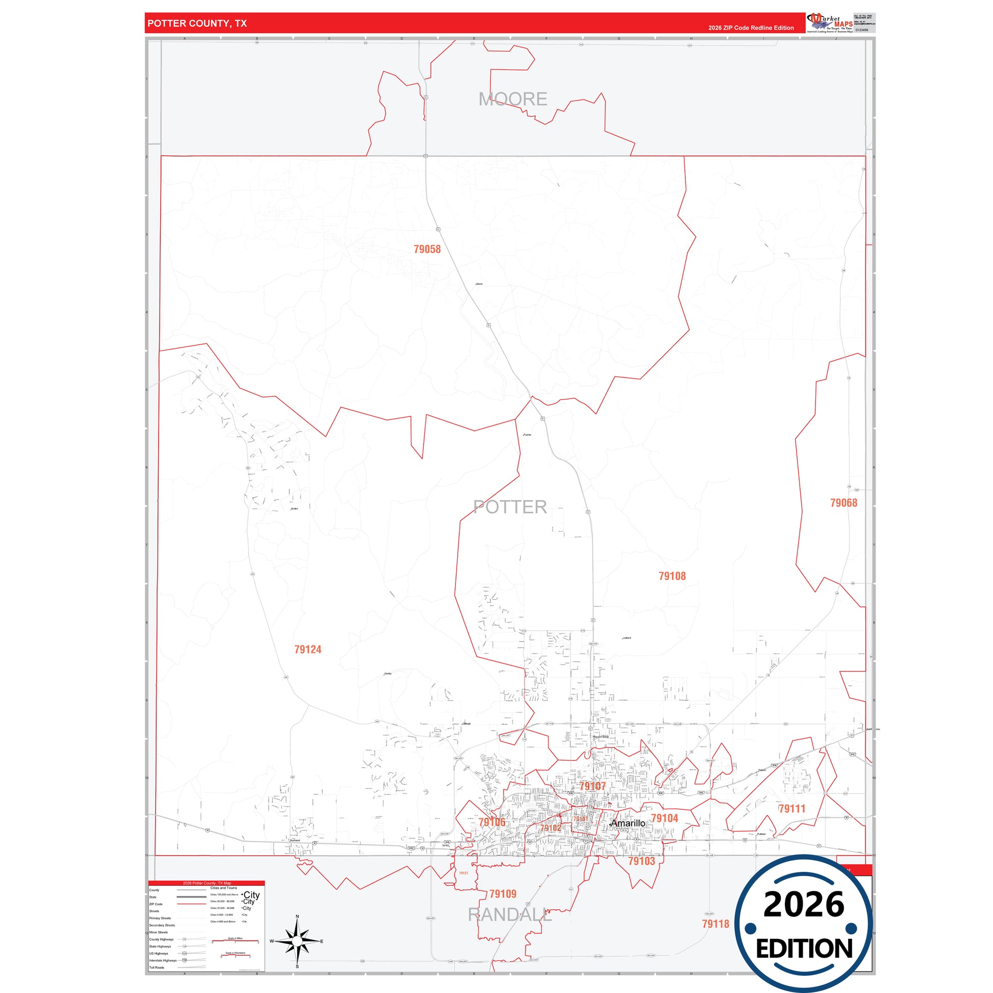 The RedLine Style map of Potter County, TX shows ZIP code areas overlaid on a detailed road network of Potter County, Texas. Ideal for drawing locations, territories, and other applications. Base map features include all major streets and highways labeled, cities and towns, county and state boundaries, neighborhood names, railroads, and a clean white background suitable for marking and planning.
