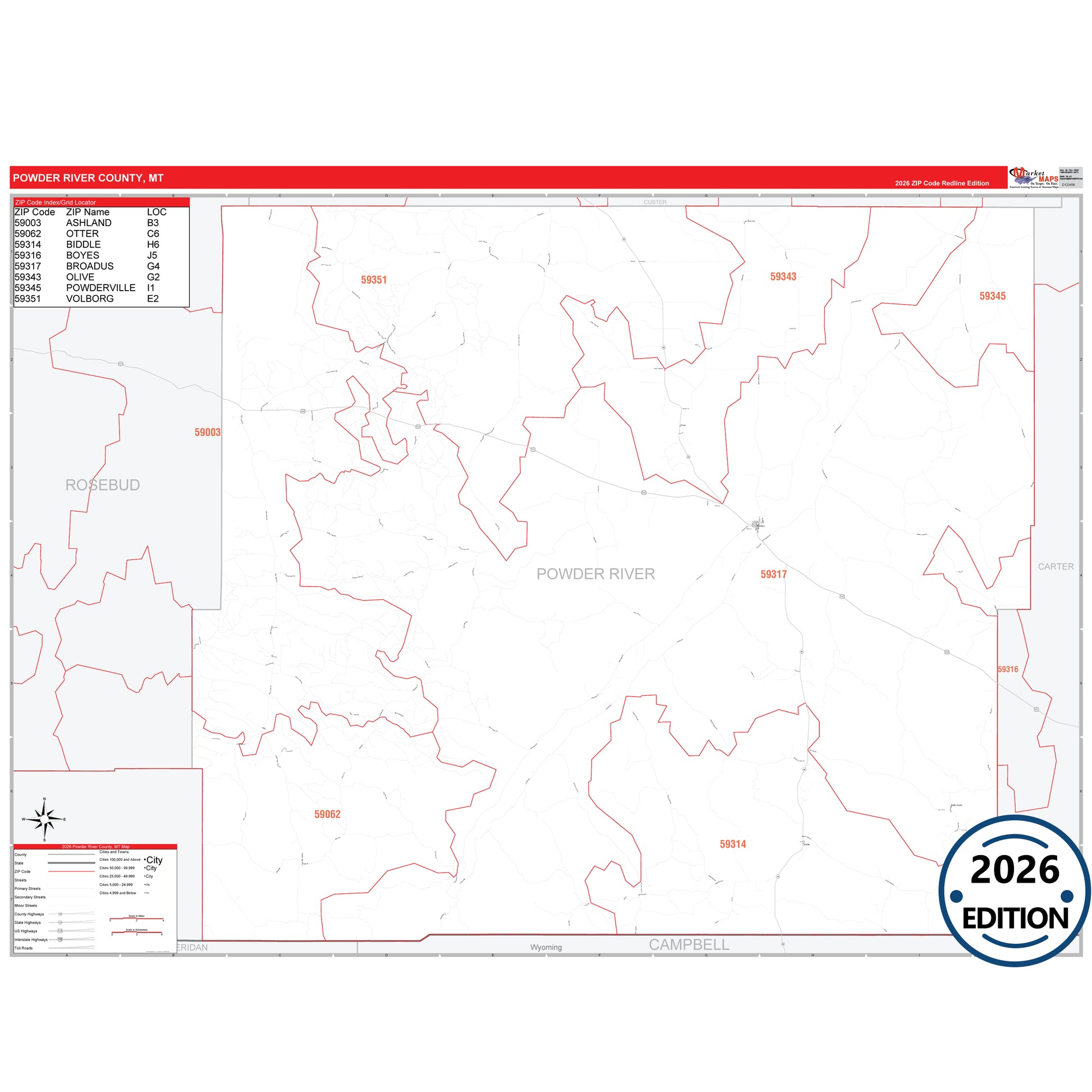 The RedLine Style map of Powder River County, MT shows ZIP code areas overlaid on a detailed road network of Powder River County, Montana. Ideal for drawing locations, territories, and other applications. Base map features include all major streets and highways labeled, cities and towns, county and state boundaries, neighborhood names, railroads, and a clean white background suitable for marking and planning.
