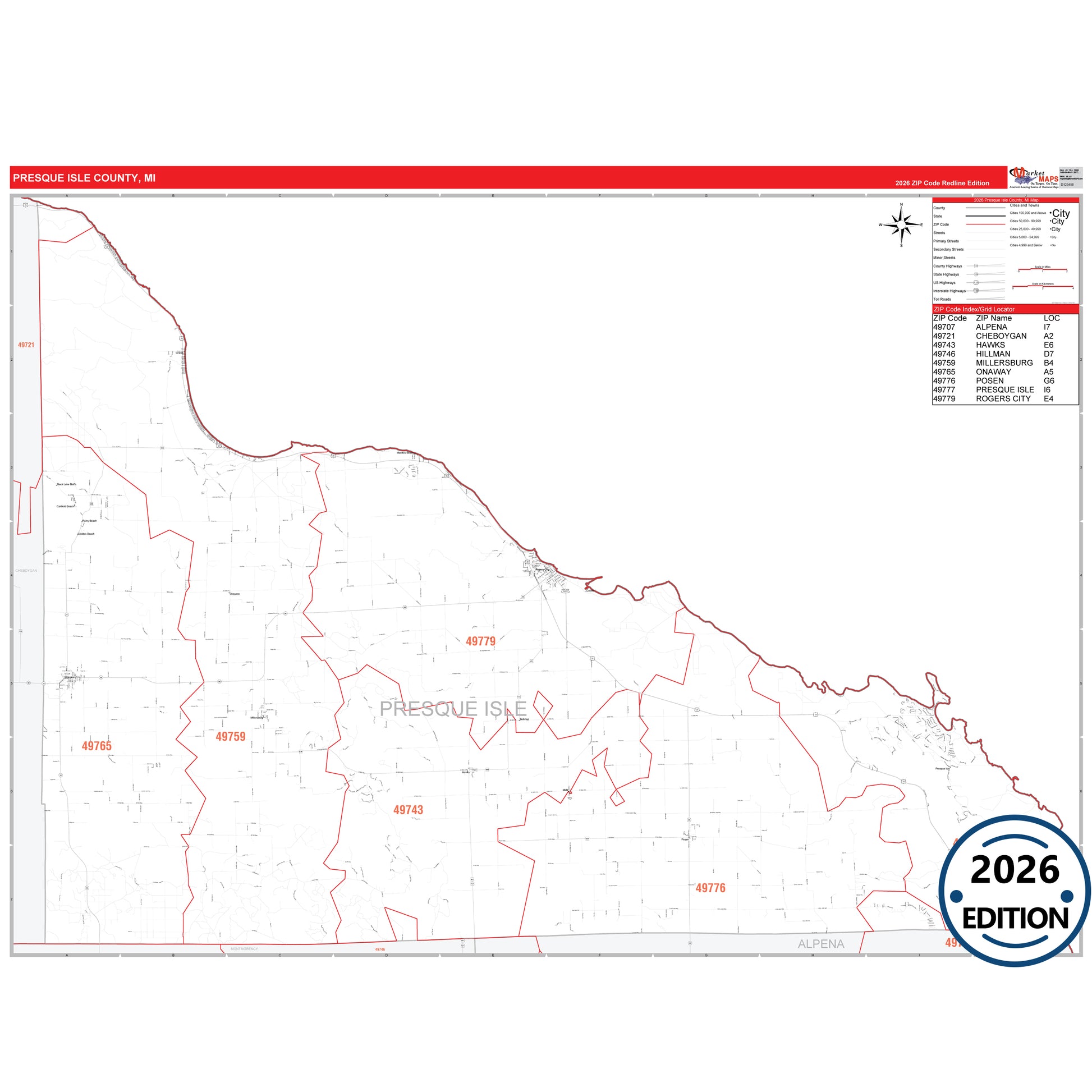 The RedLine Style map of Presque Isle County, MI shows ZIP code areas overlaid on a detailed road network of Presque Isle County, Michigan. Ideal for drawing locations, territories, and other applications. Base map features include all major streets and highways labeled, cities and towns, county and state boundaries, neighborhood names, railroads, and a clean white background suitable for marking and planning.