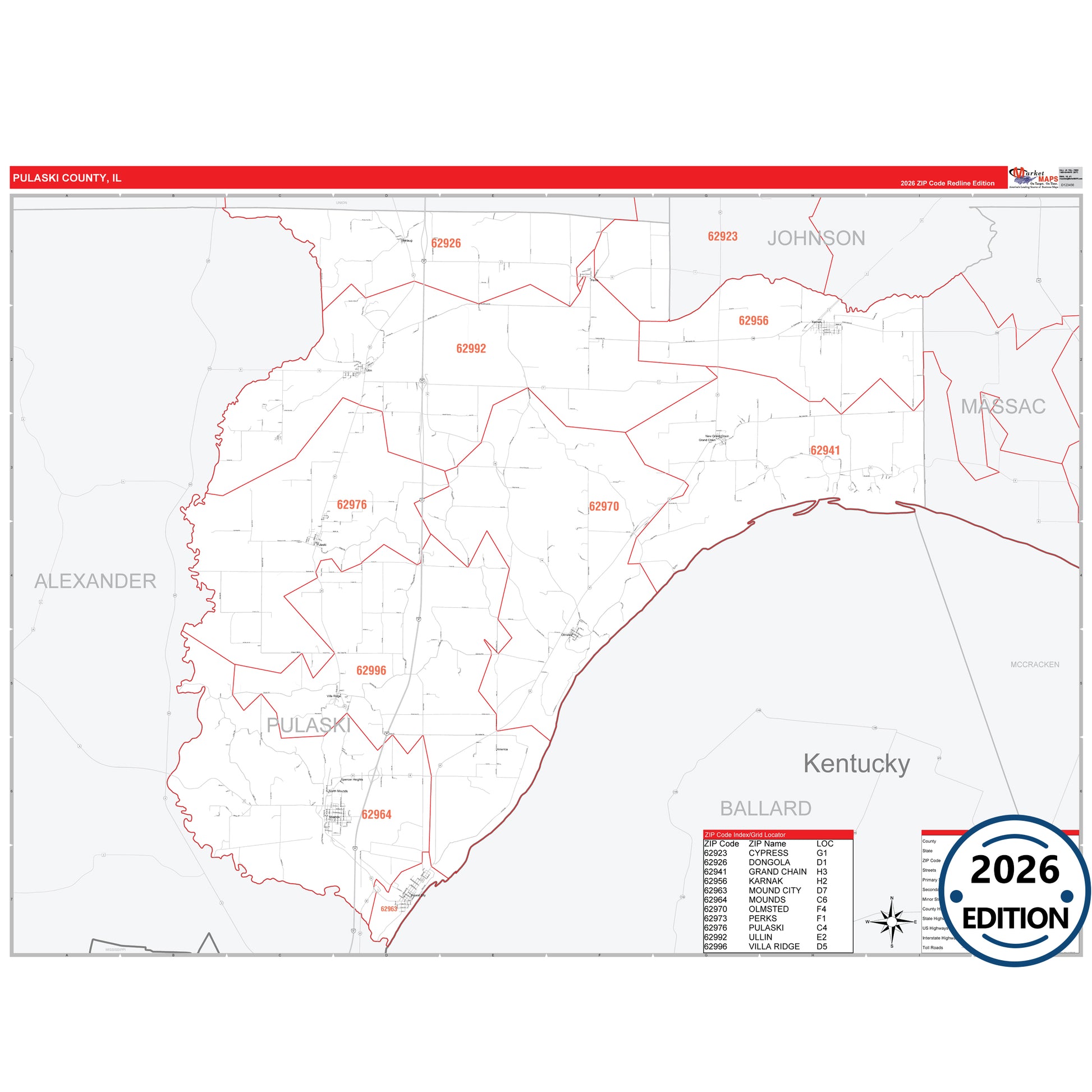The RedLine Style map of Pulaski County, IL shows ZIP code areas overlaid on a detailed road network of Pulaski County, Illinois. Ideal for drawing locations, territories, and other applications. Base map features include all major streets and highways labeled, cities and towns, county and state boundaries, neighborhood names, railroads, and a clean white background suitable for marking and planning.