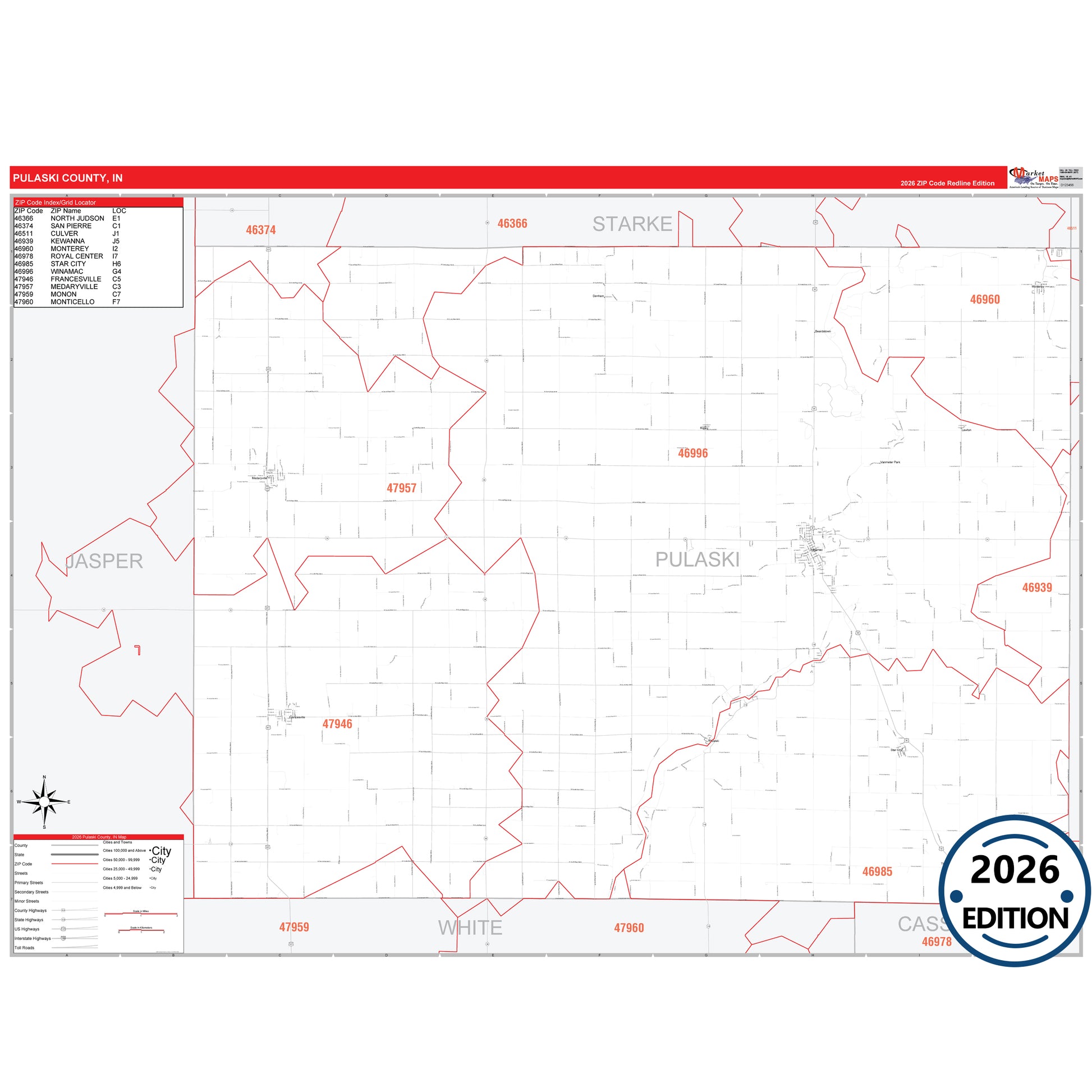 The RedLine Style map of Pulaski County, IN shows ZIP code areas overlaid on a detailed road network of Pulaski County, Indiana. Ideal for drawing locations, territories, and other applications. Base map features include all major streets and highways labeled, cities and towns, county and state boundaries, neighborhood names, railroads, and a clean white background suitable for marking and planning.