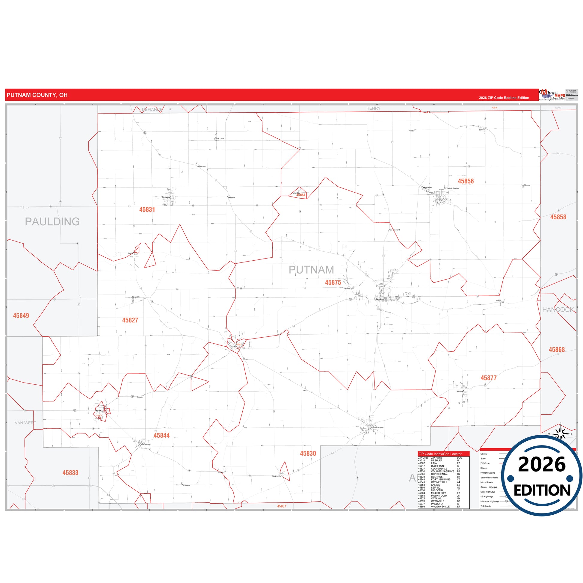 The RedLine Style map of Putnam County, OH shows ZIP code areas overlaid on a detailed road network of Putnam County, Ohio. Ideal for drawing locations, territories, and other applications. Base map features include all major streets and highways labeled, cities and towns, county and state boundaries, neighborhood names, railroads, and a clean white background suitable for marking and planning.