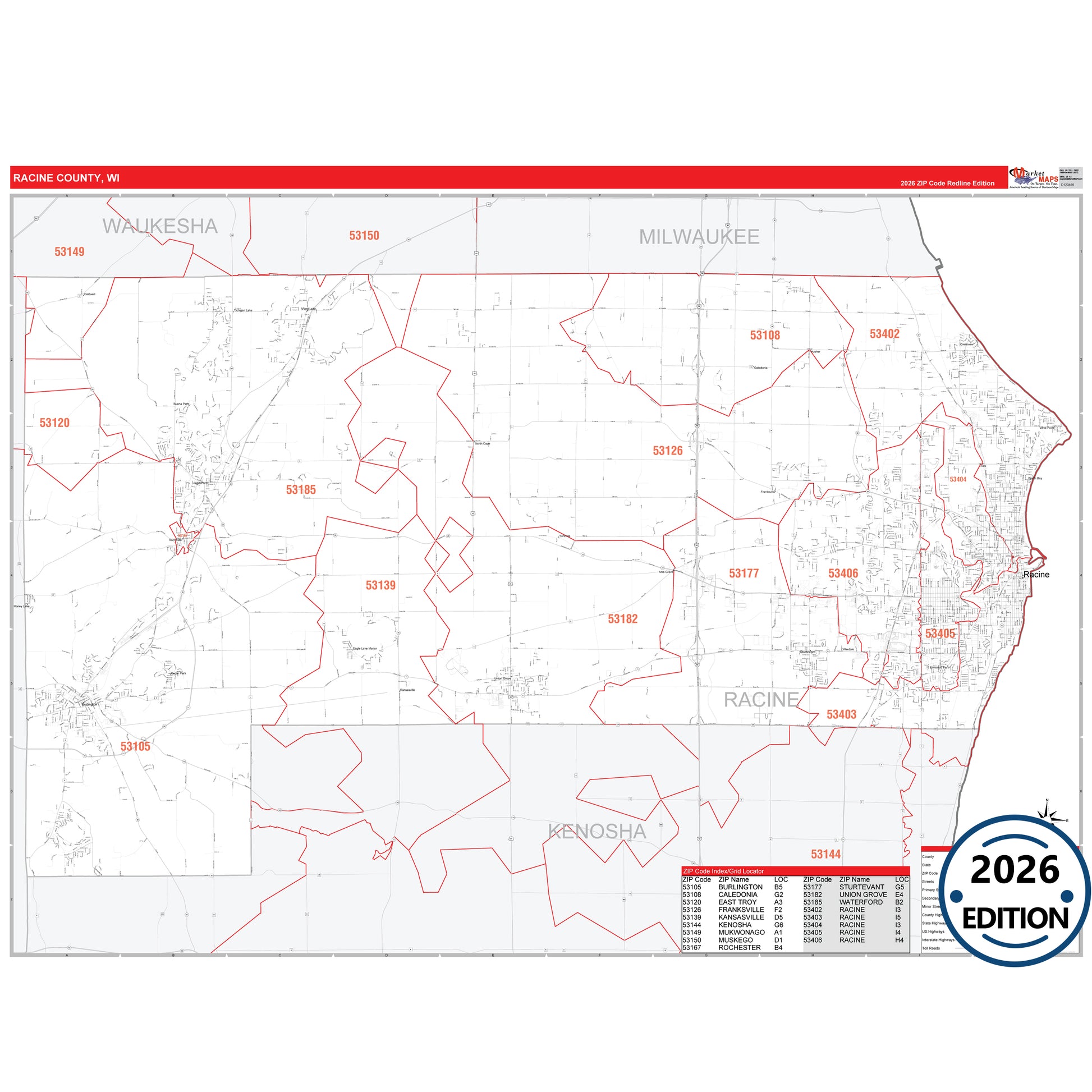 The RedLine Style map of Racine County, WI shows ZIP code areas overlaid on a detailed road network of Racine County, Wisconsin. Ideal for drawing locations, territories, and other applications. Base map features include all major streets and highways labeled, cities and towns, county and state boundaries, neighborhood names, railroads, and a clean white background suitable for marking and planning.