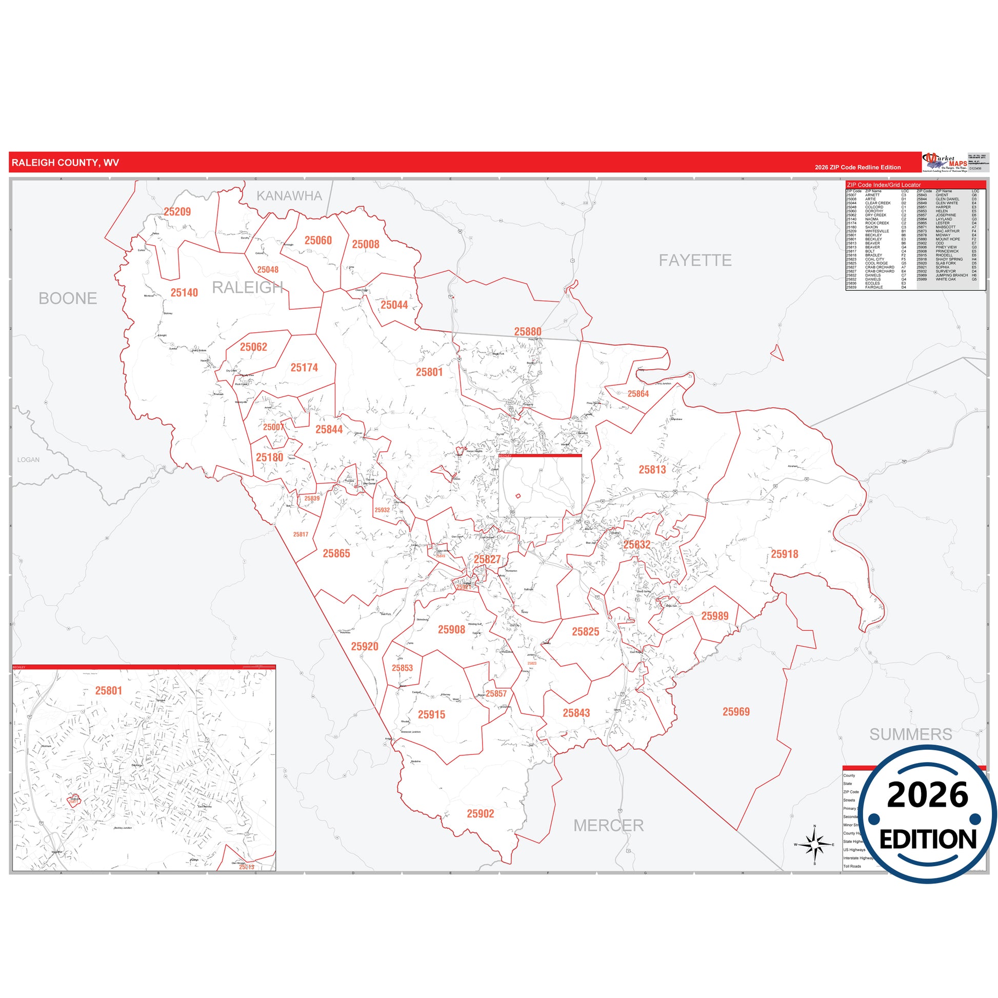 The RedLine Style map of Raleigh County, WV shows ZIP code areas overlaid on a detailed road network of Raleigh County, West Virginia. Ideal for drawing locations, territories, and other applications. Base map features include all major streets and highways labeled, cities and towns, county and state boundaries, neighborhood names, railroads, and a clean white background suitable for marking and planning.