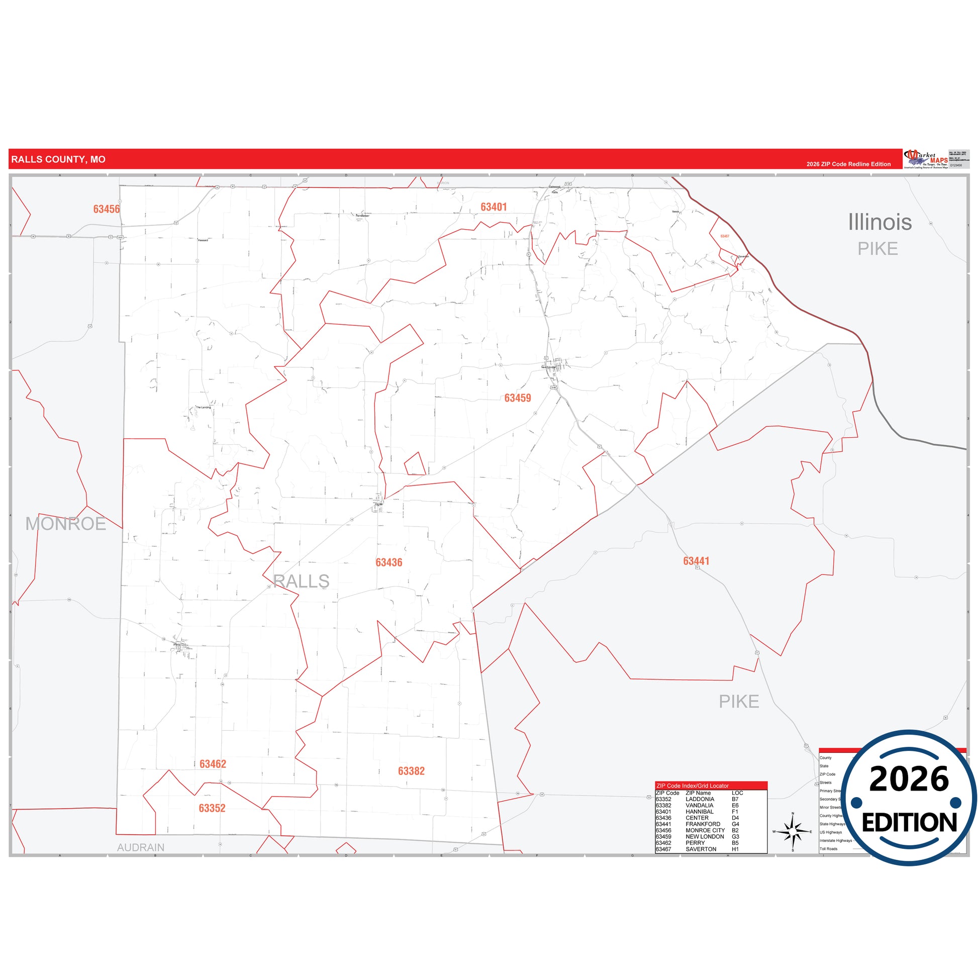 The RedLine Style map of Ralls County, MO shows ZIP code areas overlaid on a detailed road network of Ralls County, Missouri. Ideal for drawing locations, territories, and other applications. Base map features include all major streets and highways labeled, cities and towns, county and state boundaries, neighborhood names, railroads, and a clean white background suitable for marking and planning.