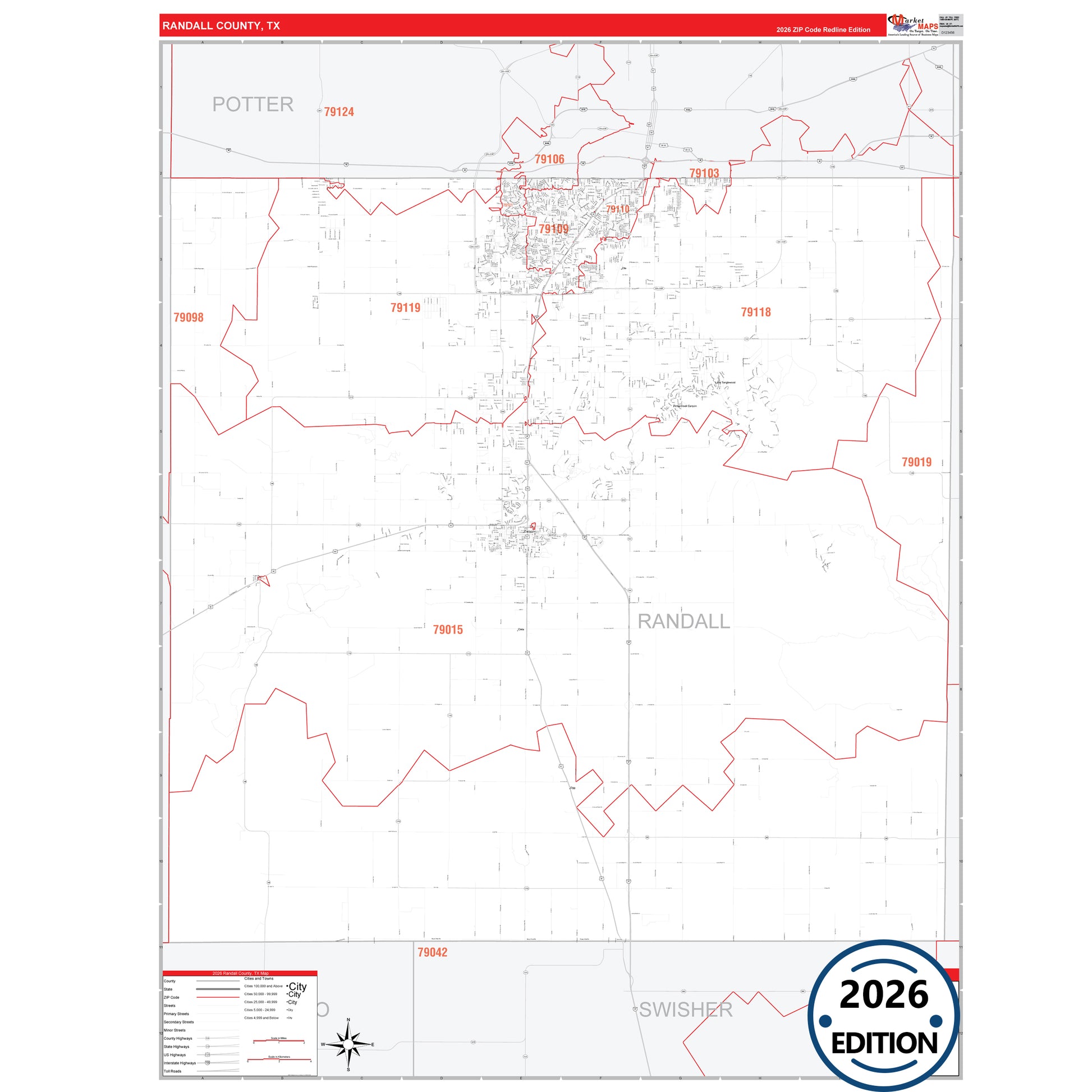 The RedLine Style map of Randall County, TX shows ZIP code areas overlaid on a detailed road network of Randall County, Texas. Ideal for drawing locations, territories, and other applications. Base map features include all major streets and highways labeled, cities and towns, county and state boundaries, neighborhood names, railroads, and a clean white background suitable for marking and planning.
