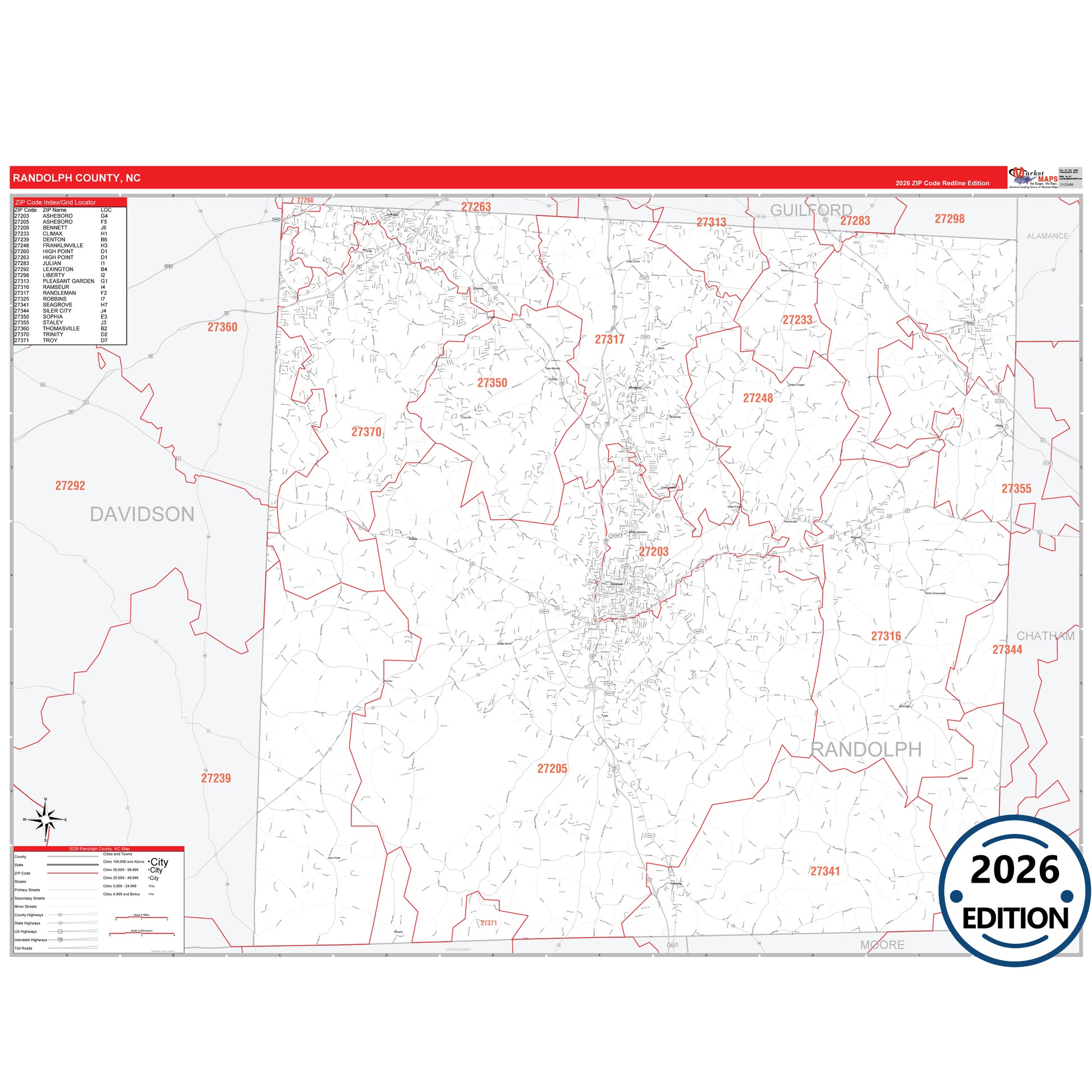 The RedLine Style map of Randolph County, NC shows ZIP code areas overlaid on a detailed road network of Randolph County, North Carolina. Ideal for drawing locations, territories, and other applications. Base map features include all major streets and highways labeled, cities and towns, county and state boundaries, neighborhood names, railroads, and a clean white background suitable for marking and planning.