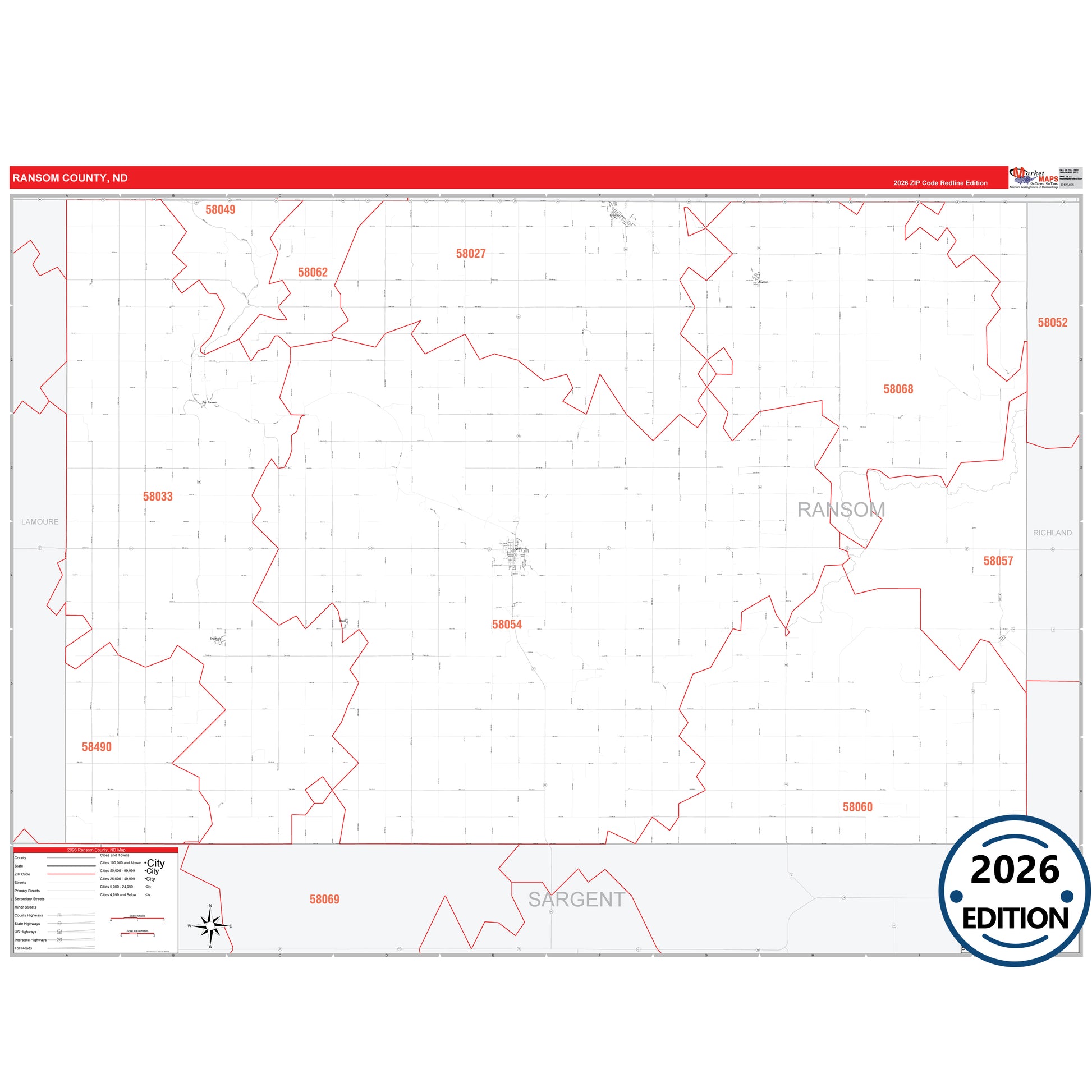 The RedLine Style map of Ransom County, ND shows ZIP code areas overlaid on a detailed road network of Ransom County, North Dakota. Ideal for drawing locations, territories, and other applications. Base map features include all major streets and highways labeled, cities and towns, county and state boundaries, neighborhood names, railroads, and a clean white background suitable for marking and planning.