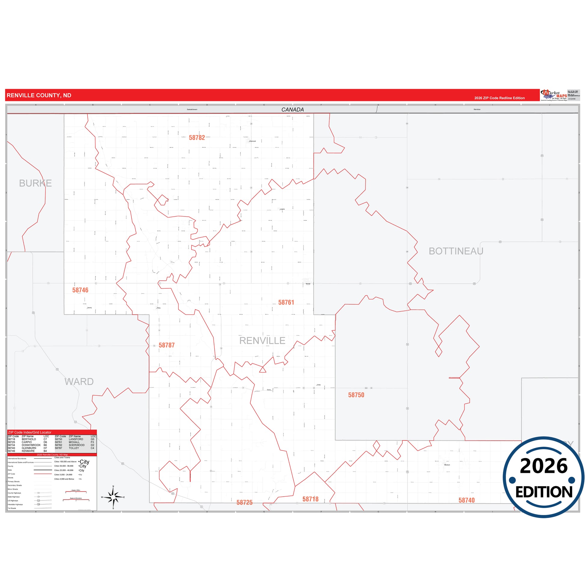 The RedLine Style map of Renville County, ND shows ZIP code areas overlaid on a detailed road network of Renville County, North Dakota. Ideal for drawing locations, territories, and other applications. Base map features include all major streets and highways labeled, cities and towns, county and state boundaries, neighborhood names, railroads, and a clean white background suitable for marking and planning.