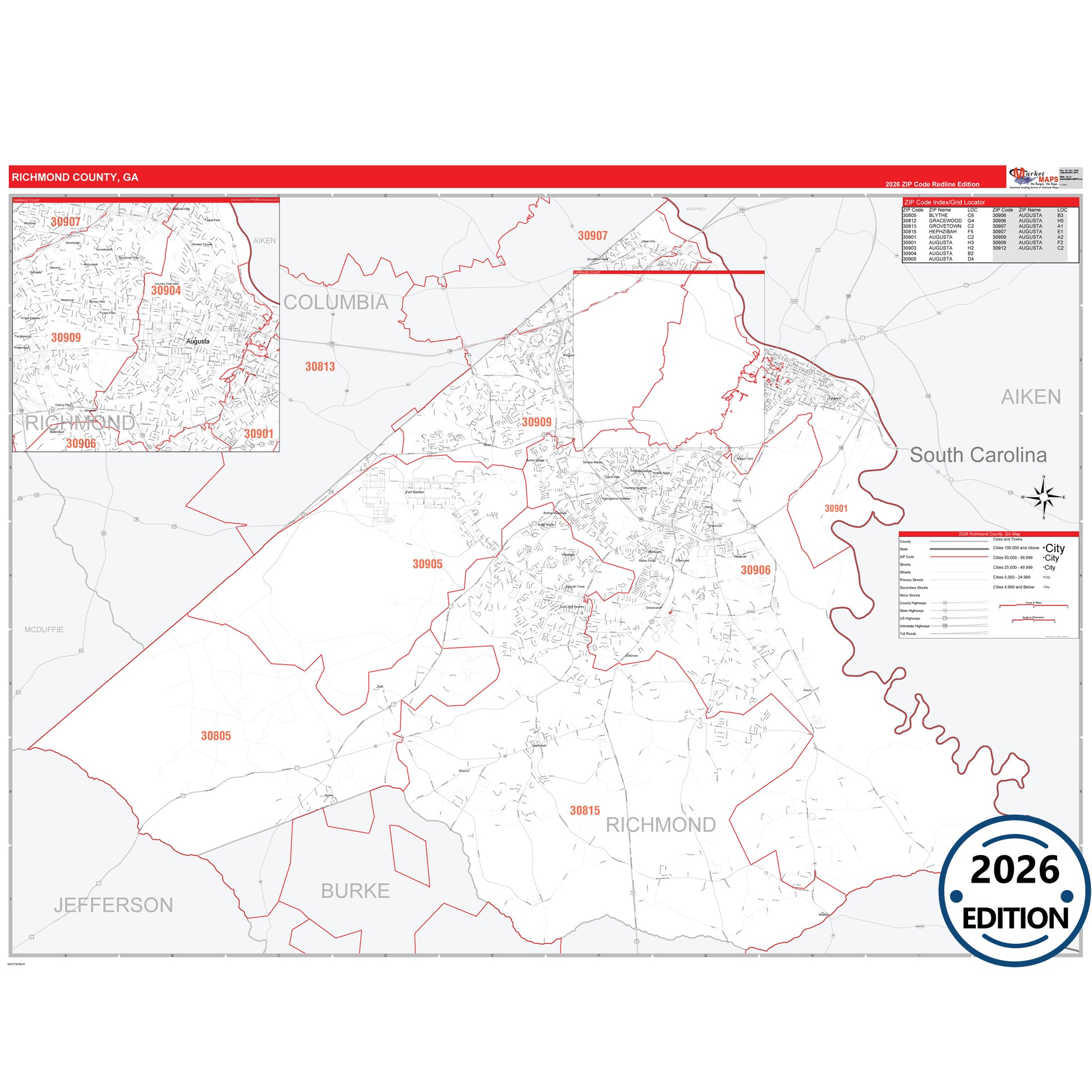 The RedLine Style map of Richmond County, GA shows ZIP code areas overlaid on a detailed road network of Richmond County, Georgia. Ideal for drawing locations, territories, and other applications. Base map features include all major streets and highways labeled, cities and towns, county and state boundaries, neighborhood names, railroads, and a clean white background suitable for marking and planning.