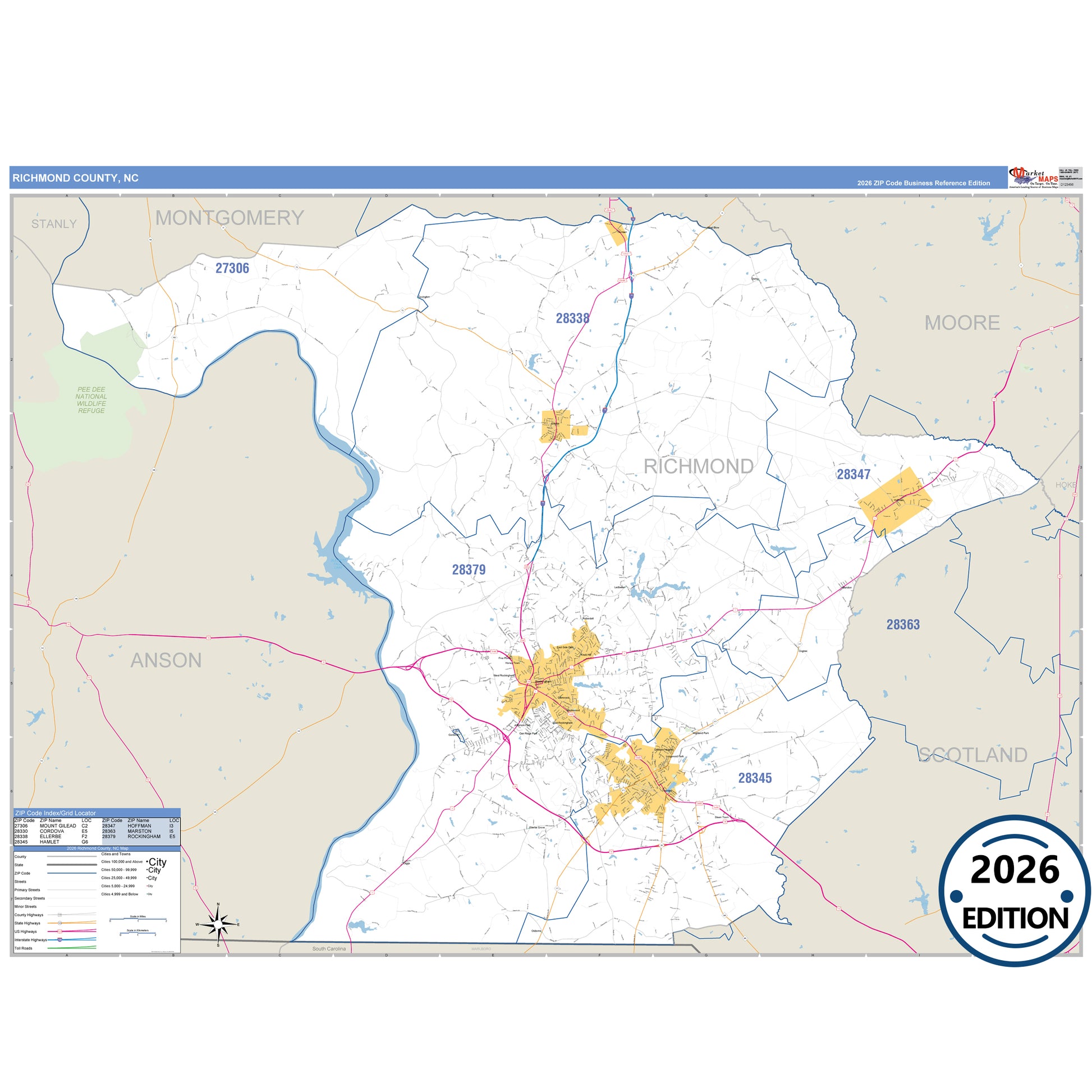 The Business Reference Style Richmond County, NC is a detailed map that includes all towns, cities, major roadways, and highways. Available in multiple wall map sizes, perfect for home, school, office, or business display.