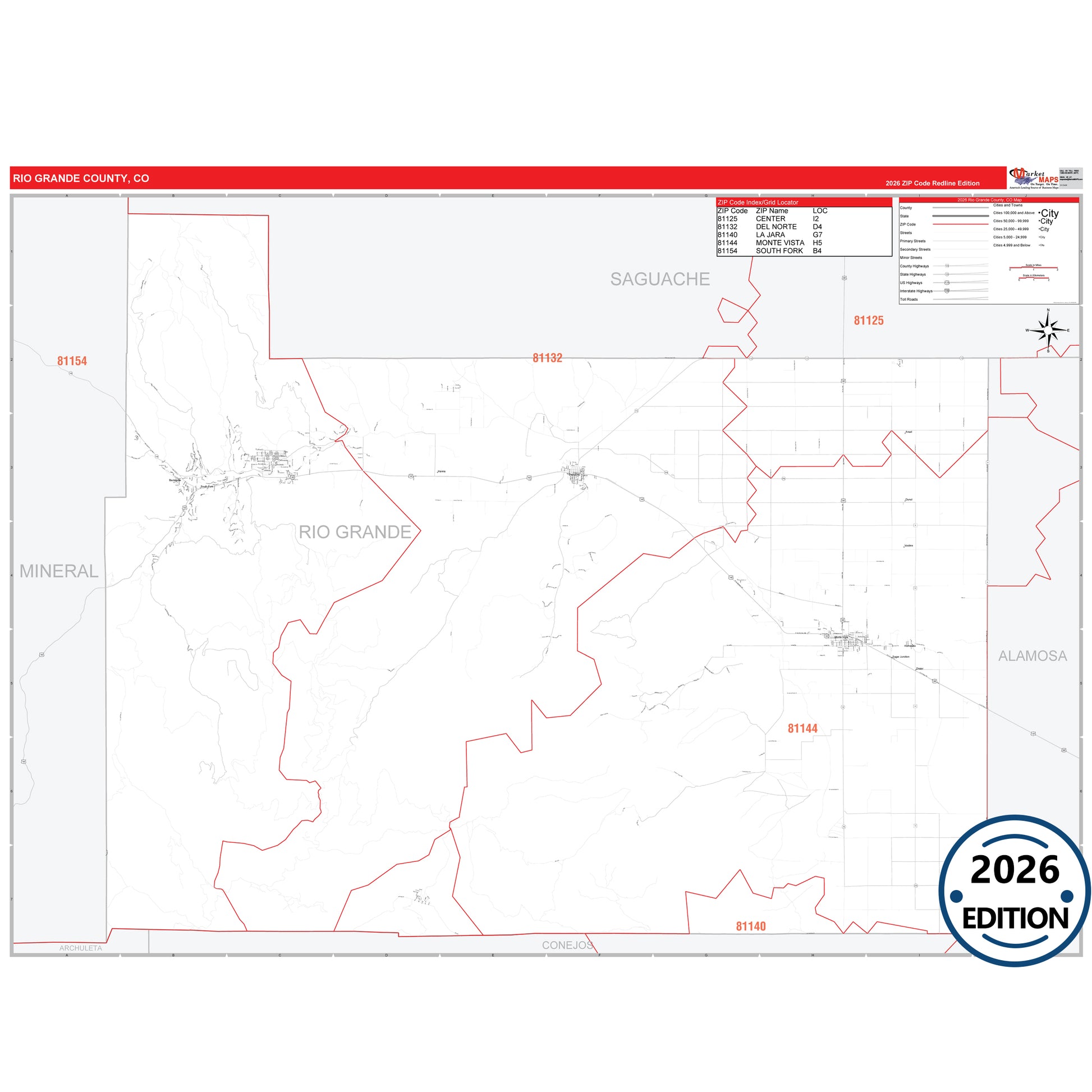 The RedLine Style map of Rio Grande County, CO shows ZIP code areas overlaid on a detailed road network of Rio Grande County, Colorado. Ideal for drawing locations, territories, and other applications. Base map features include all major streets and highways labeled, cities and towns, county and state boundaries, neighborhood names, railroads, and a clean white background suitable for marking and planning.