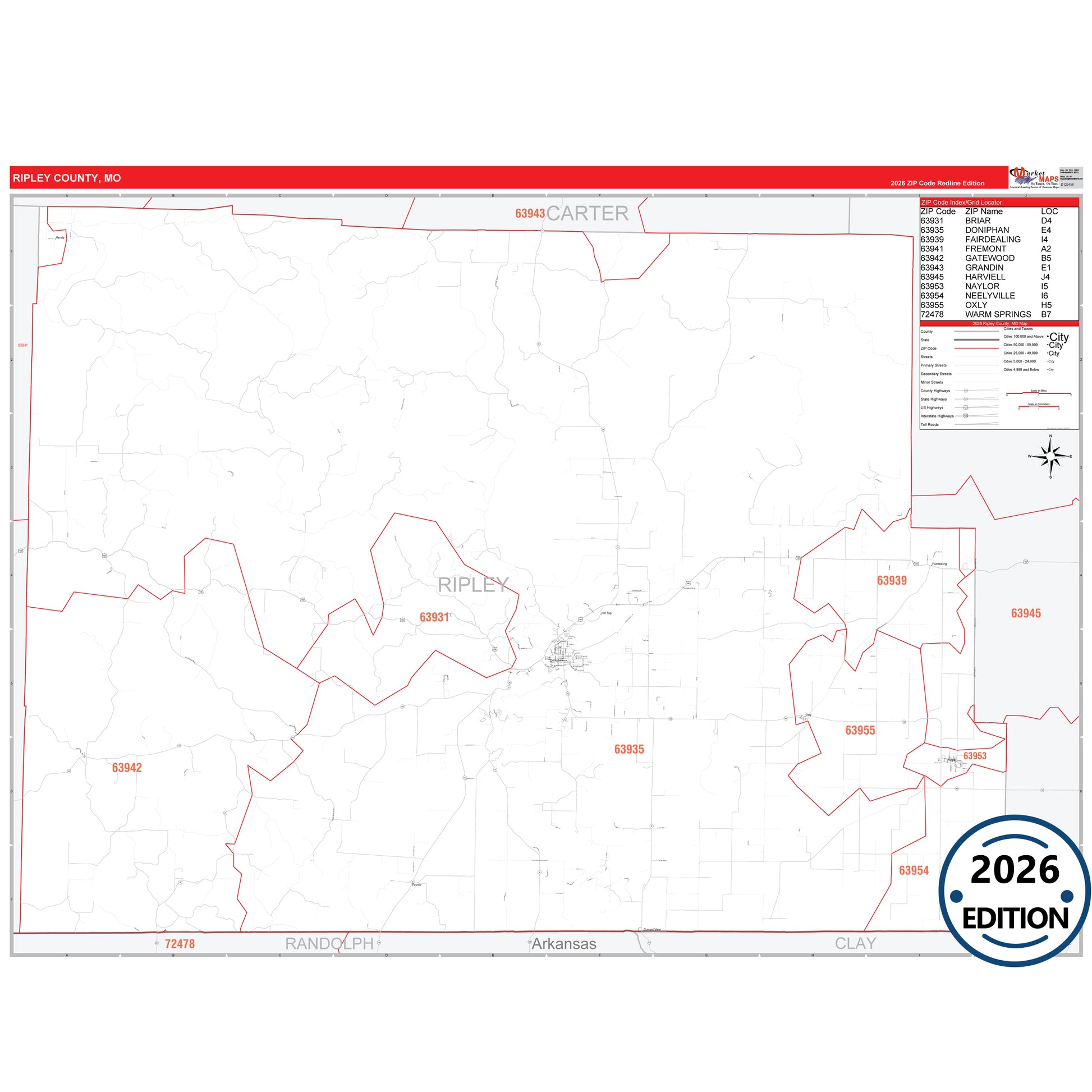 The RedLine Style map of Ripley County, MO shows ZIP code areas overlaid on a detailed road network of Ripley County, Missouri. Ideal for drawing locations, territories, and other applications. Base map features include all major streets and highways labeled, cities and towns, county and state boundaries, neighborhood names, railroads, and a clean white background suitable for marking and planning.