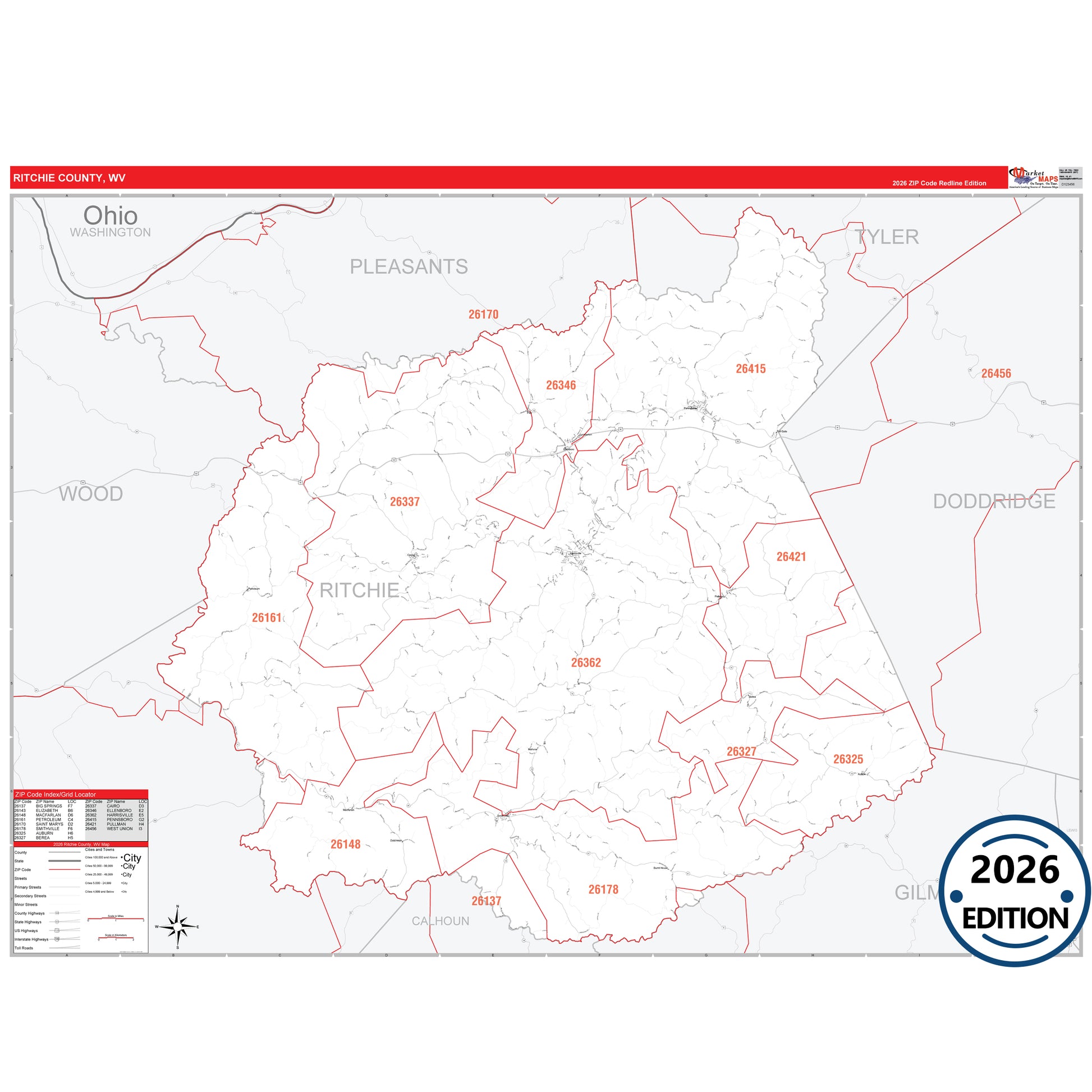 The RedLine Style map of Ritchie County, WV shows ZIP code areas overlaid on a detailed road network of Ritchie County, West Virginia. Ideal for drawing locations, territories, and other applications. Base map features include all major streets and highways labeled, cities and towns, county and state boundaries, neighborhood names, railroads, and a clean white background suitable for marking and planning.