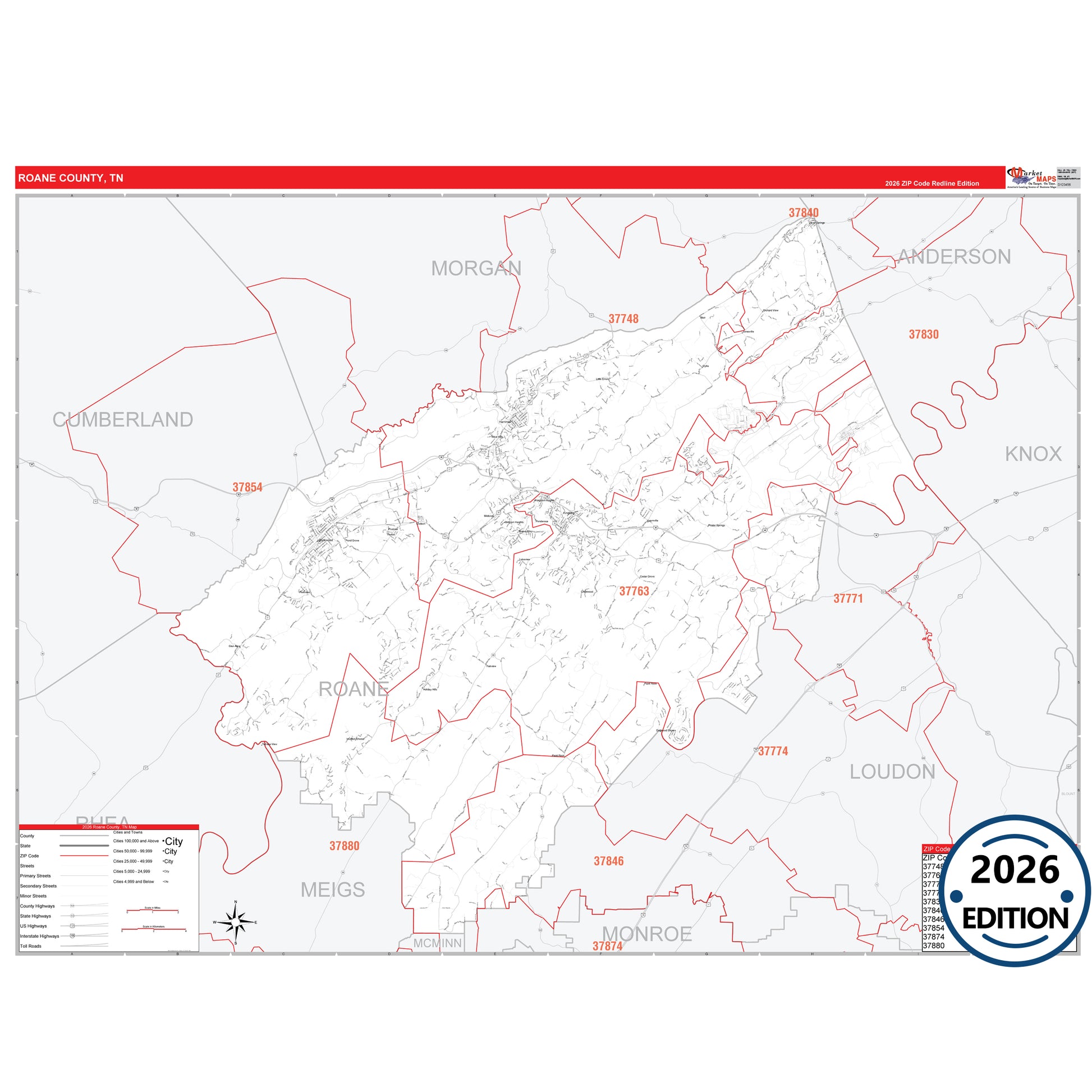 The RedLine Style map of Roane County, TN shows ZIP code areas overlaid on a detailed road network of Roane County, Tennessee. Ideal for drawing locations, territories, and other applications. Base map features include all major streets and highways labeled, cities and towns, county and state boundaries, neighborhood names, railroads, and a clean white background suitable for marking and planning.