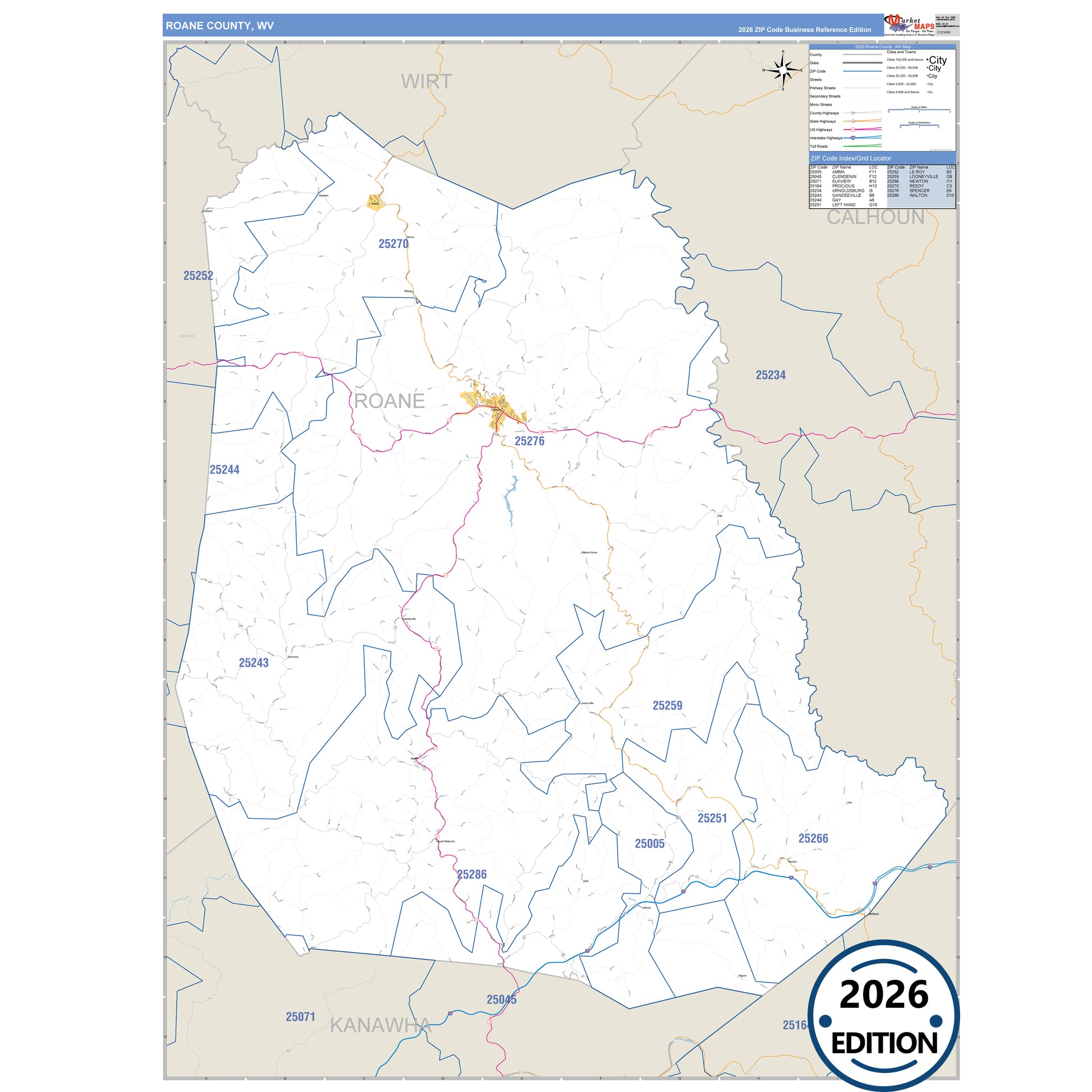 The Business Reference Style Roane County, WV is a detailed map that includes all towns, cities, major roadways, and highways. Available in multiple wall map sizes, perfect for home, school, office, or business display.