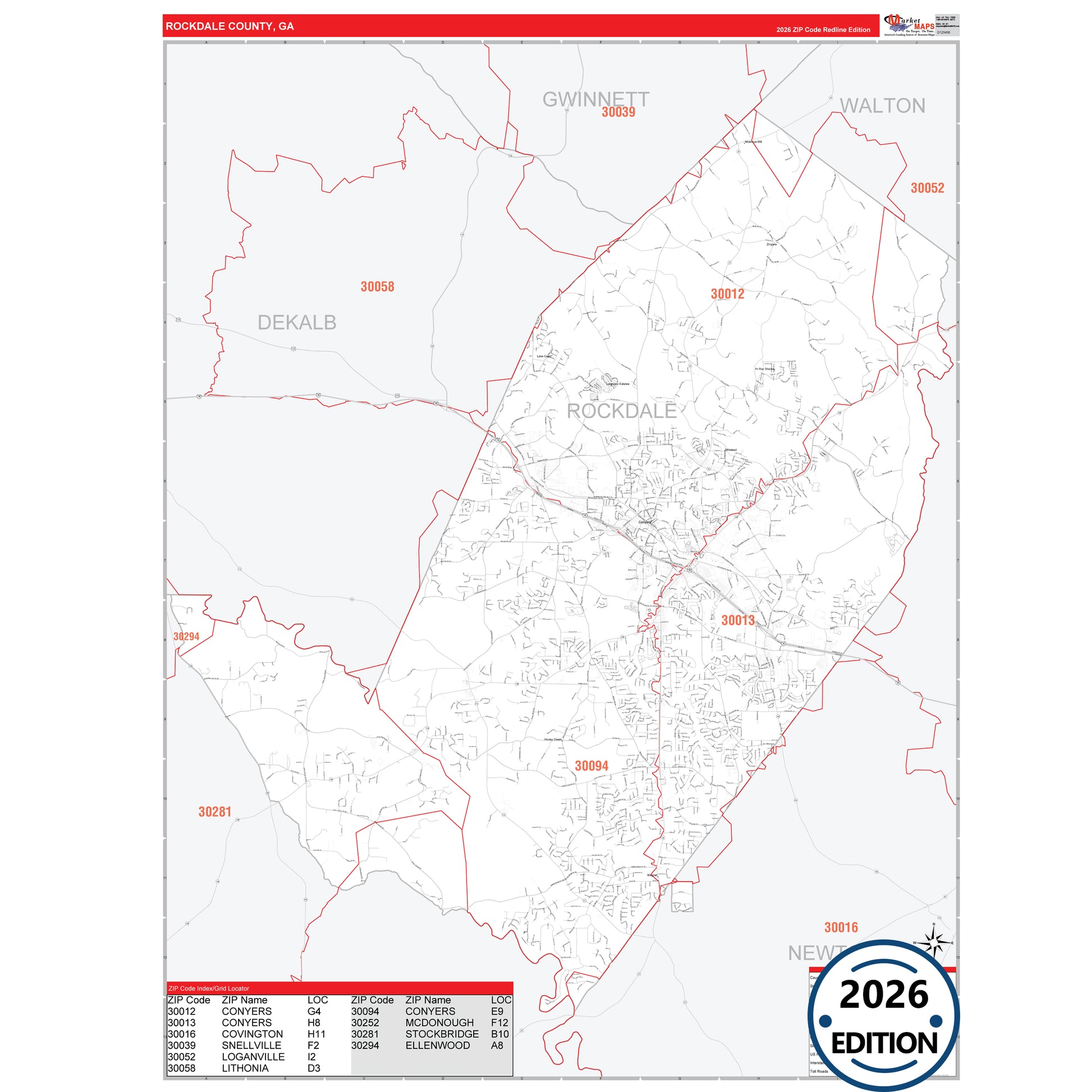 The RedLine Style map of Rockdale County, GA shows ZIP code areas overlaid on a detailed road network of Rockdale County, Georgia. Ideal for drawing locations, territories, and other applications. Base map features include all major streets and highways labeled, cities and towns, county and state boundaries, neighborhood names, railroads, and a clean white background suitable for marking and planning.