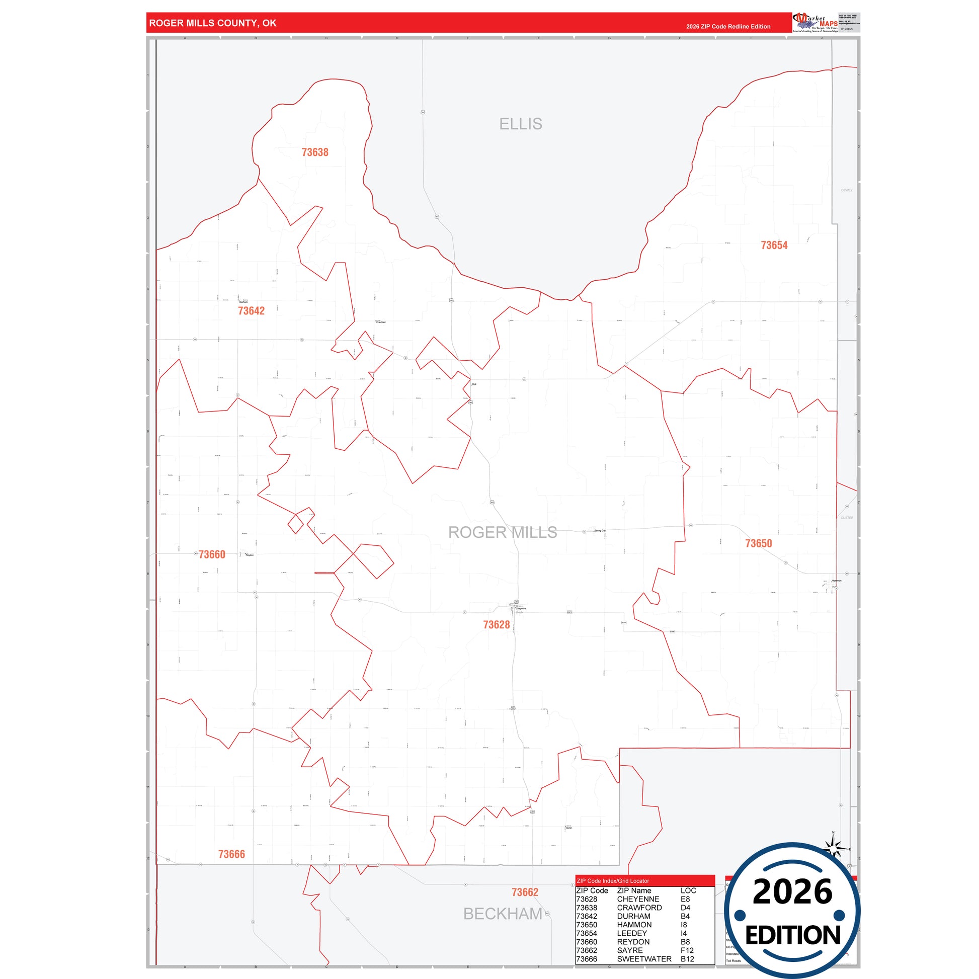 The RedLine Style map of Roger Mills County, OK shows ZIP code areas overlaid on a detailed road network of Roger Mills County, Oklahoma. Ideal for drawing locations, territories, and other applications. Base map features include all major streets and highways labeled, cities and towns, county and state boundaries, neighborhood names, railroads, and a clean white background suitable for marking and planning.