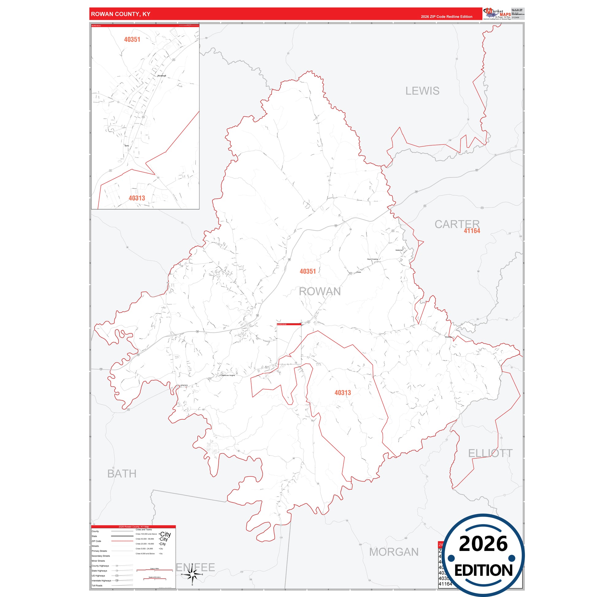 The RedLine Style map of Rowan County, KY shows ZIP code areas overlaid on a detailed road network of Rowan County, Kentucky. Ideal for drawing locations, territories, and other applications. Base map features include all major streets and highways labeled, cities and towns, county and state boundaries, neighborhood names, railroads, and a clean white background suitable for marking and planning.
