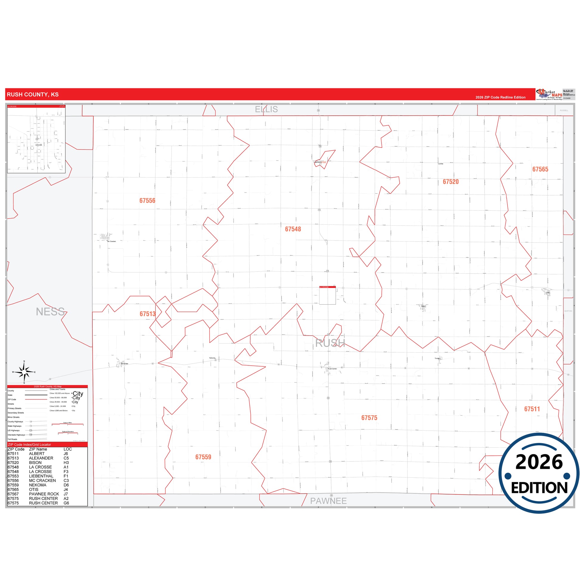 The RedLine Style map of Rush County, KS shows ZIP code areas overlaid on a detailed road network of Rush County, Kansas. Ideal for drawing locations, territories, and other applications. Base map features include all major streets and highways labeled, cities and towns, county and state boundaries, neighborhood names, railroads, and a clean white background suitable for marking and planning.