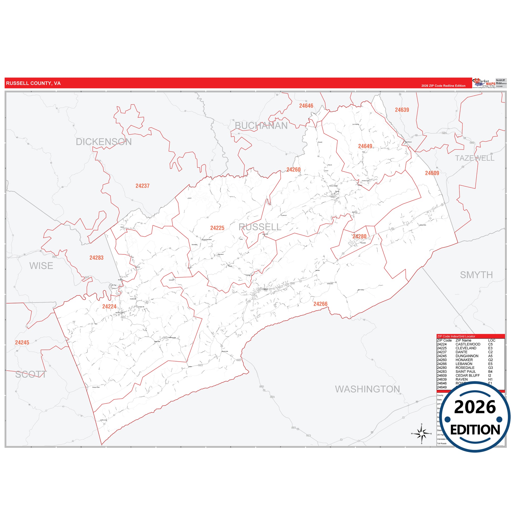 The RedLine Style map of Russell County, VA shows ZIP code areas overlaid on a detailed road network of Russell County, Virginia. Ideal for drawing locations, territories, and other applications. Base map features include all major streets and highways labeled, cities and towns, county and state boundaries, neighborhood names, railroads, and a clean white background suitable for marking and planning.