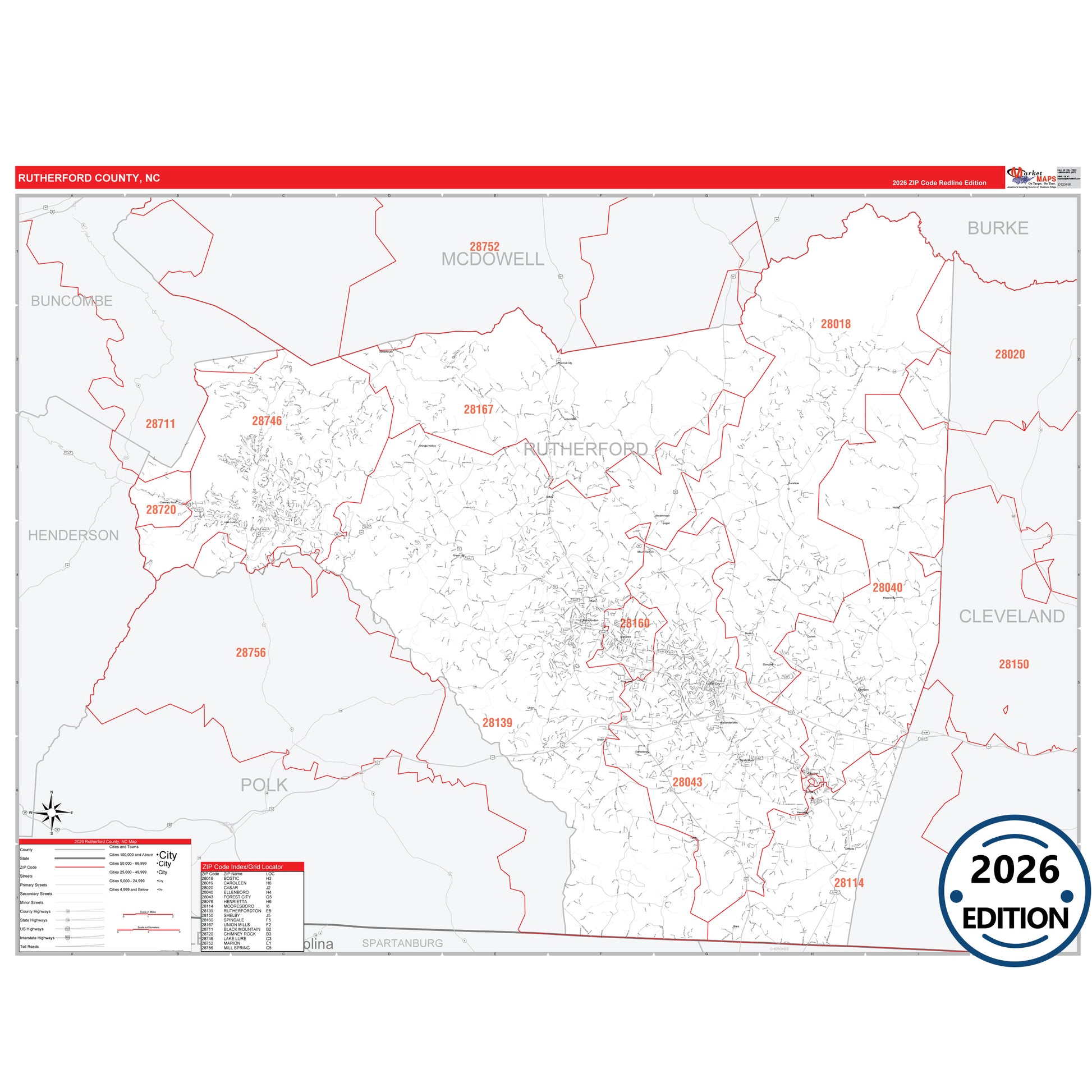 The RedLine Style map of Rutherford County, NC shows ZIP code areas overlaid on a detailed road network of Rutherford County, North Carolina. Ideal for drawing locations, territories, and other applications. Base map features include all major streets and highways labeled, cities and towns, county and state boundaries, neighborhood names, railroads, and a clean white background suitable for marking and planning.