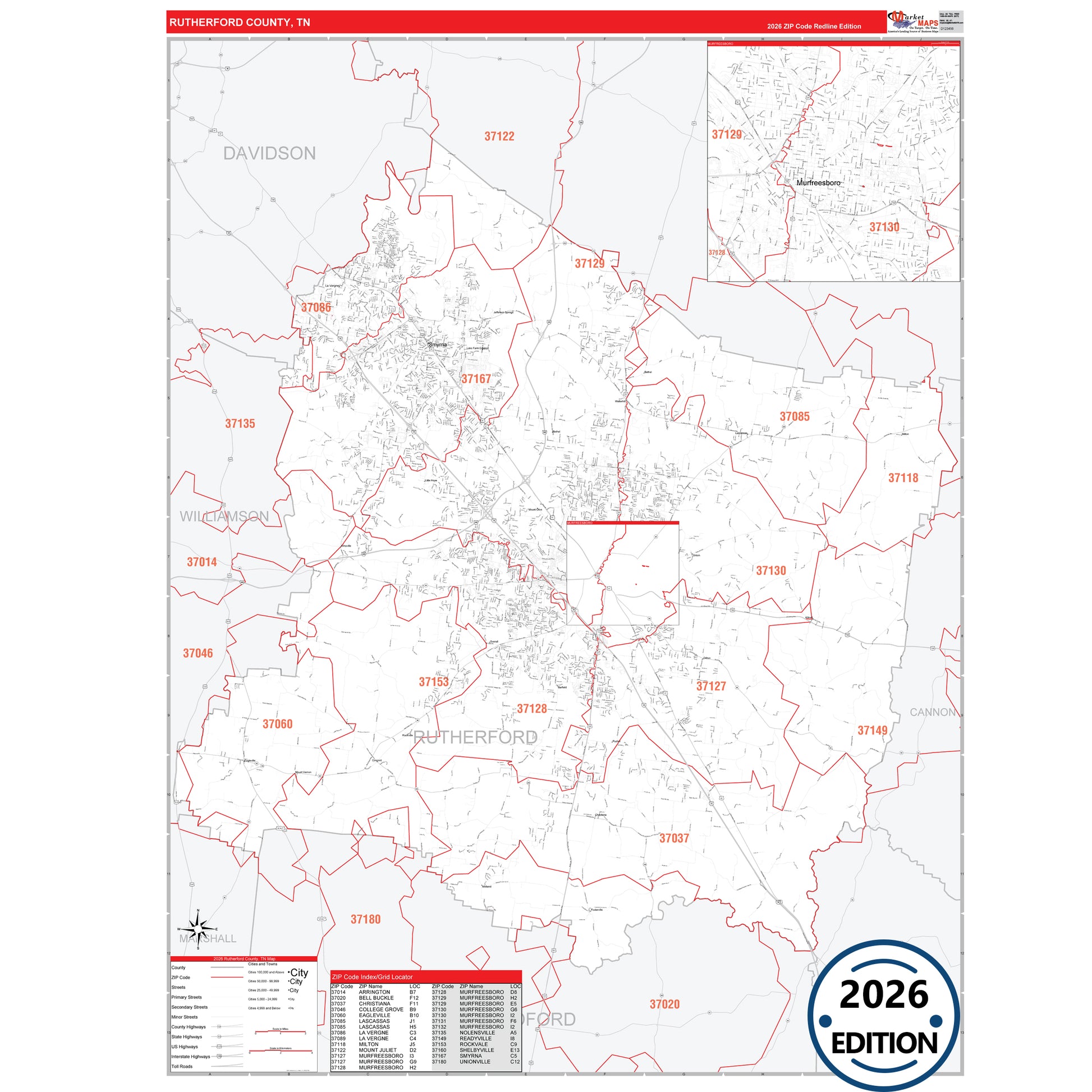 The RedLine Style map of Rutherford County, TN shows ZIP code areas overlaid on a detailed road network of Rutherford County, Tennessee. Ideal for drawing locations, territories, and other applications. Base map features include all major streets and highways labeled, cities and towns, county and state boundaries, neighborhood names, railroads, and a clean white background suitable for marking and planning.