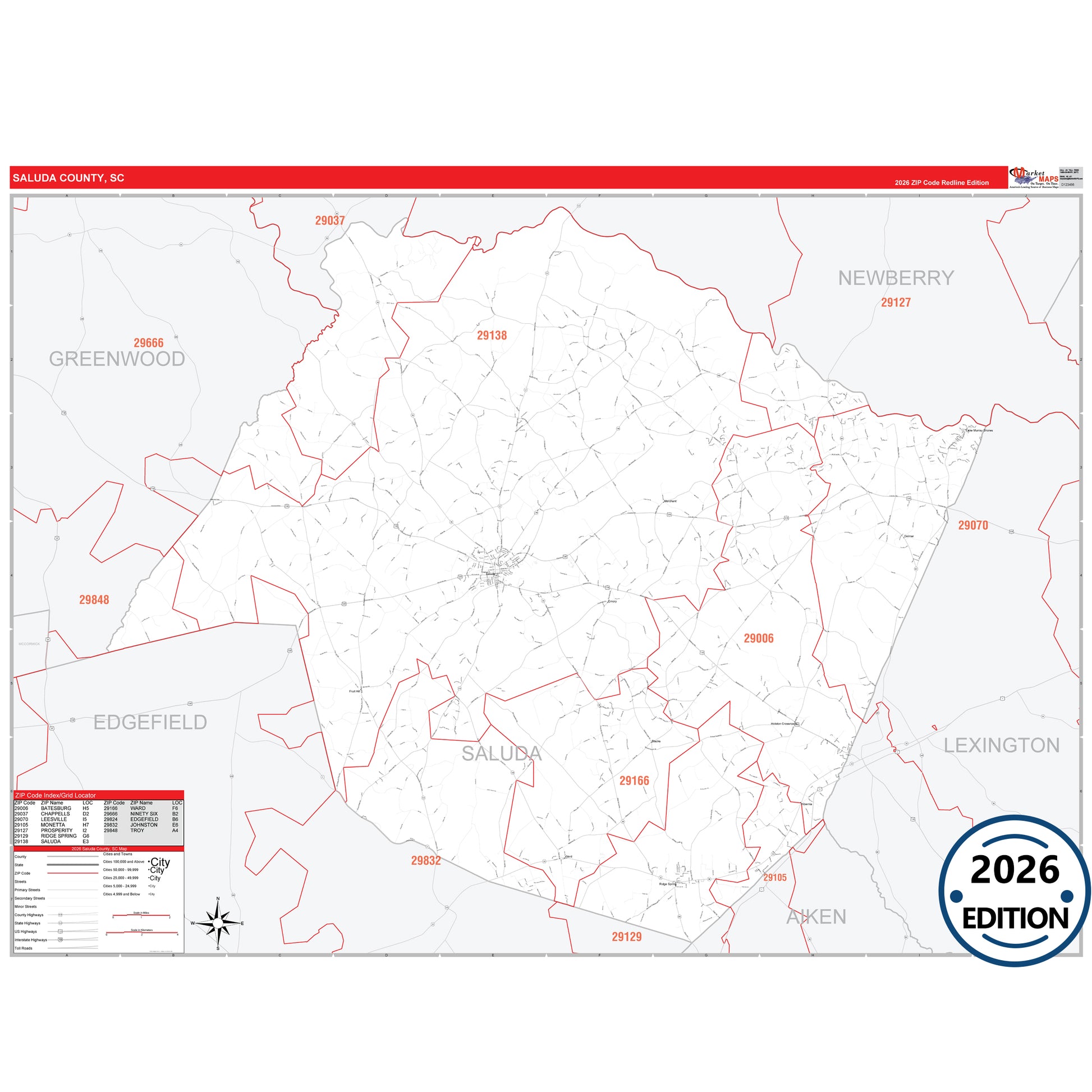 The RedLine Style map of Saluda County, SC shows ZIP code areas overlaid on a detailed road network of Saluda County, South Carolina. Ideal for drawing locations, territories, and other applications. Base map features include all major streets and highways labeled, cities and towns, county and state boundaries, neighborhood names, railroads, and a clean white background suitable for marking and planning.